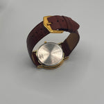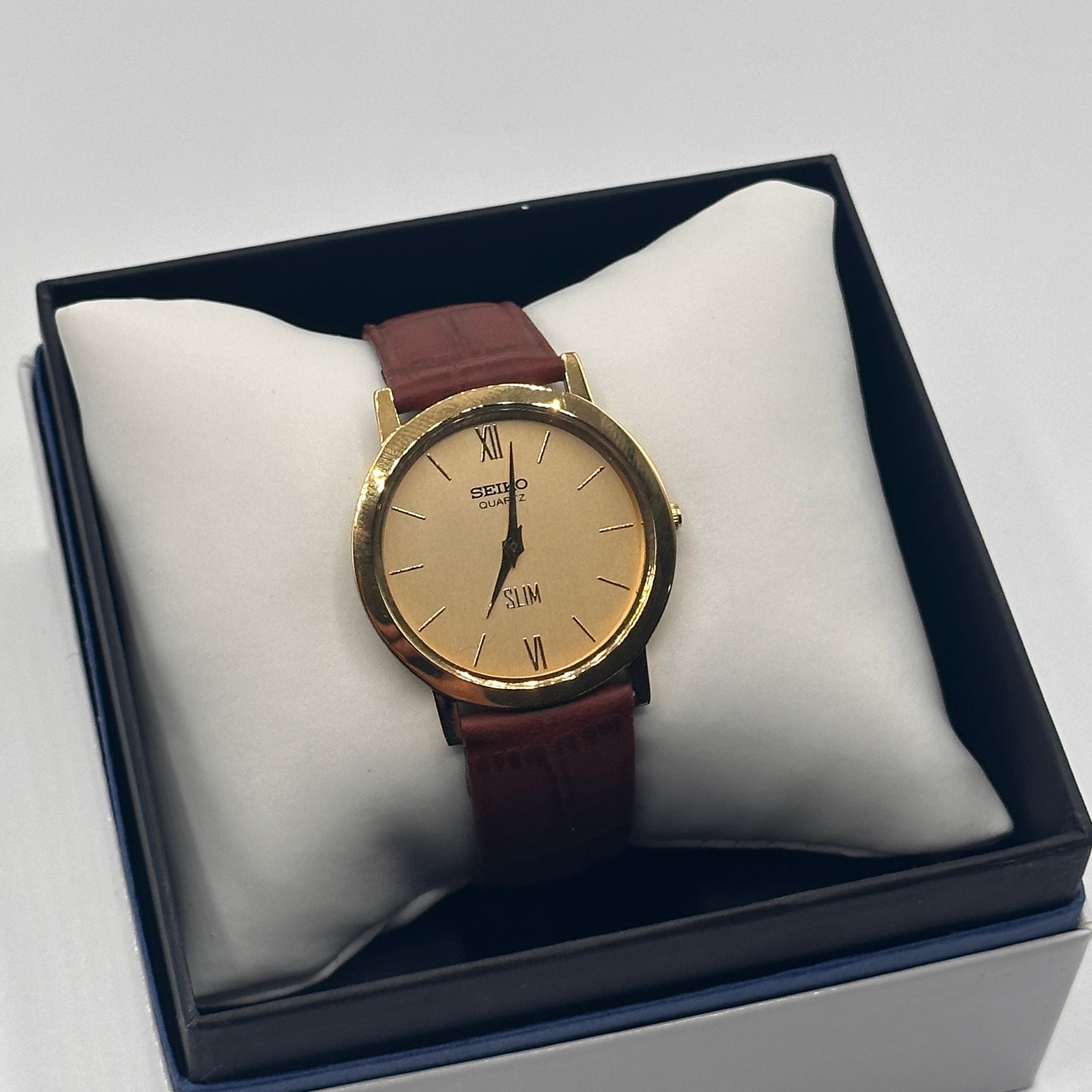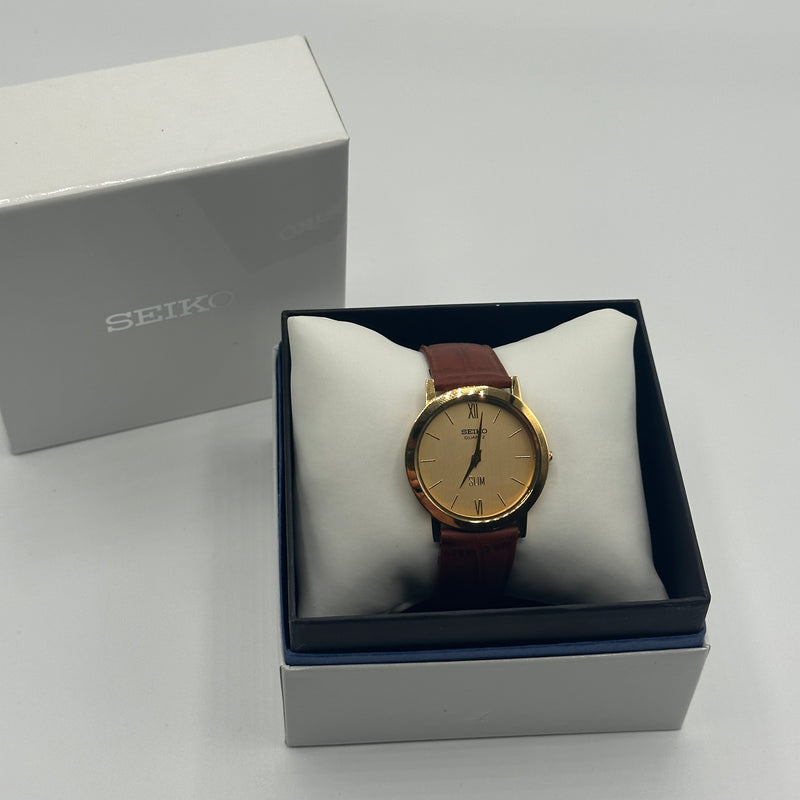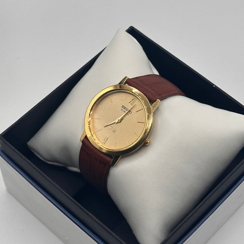 Gents Seiko Quartz with a gold plated case and on a leather strap. This watch features a gold dial with gold roman numeral hour markers at 12 and 6 O'Clock.