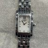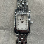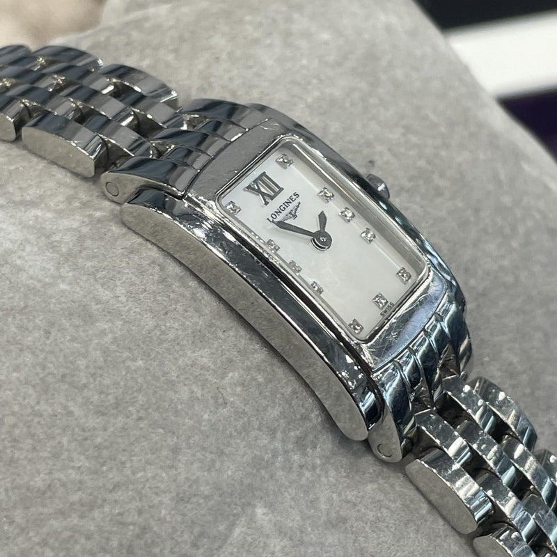 The Longines DolceVita is a ladies' watch that showcases the brand's dedication to elegance and timeless design. This DolceVita, reference L5.158.4, has a rectangular polished stainless steel case, with a white mother-of-pearl adorned with diamond hour markers and a prominent Roman numeral at 12 o'clock. The dial is protected by a scratch-resistant sapphire crystal, ensuring durability and clarity. The five-link metal bracelet is both formal and perfectly appropriate with casual attire.
