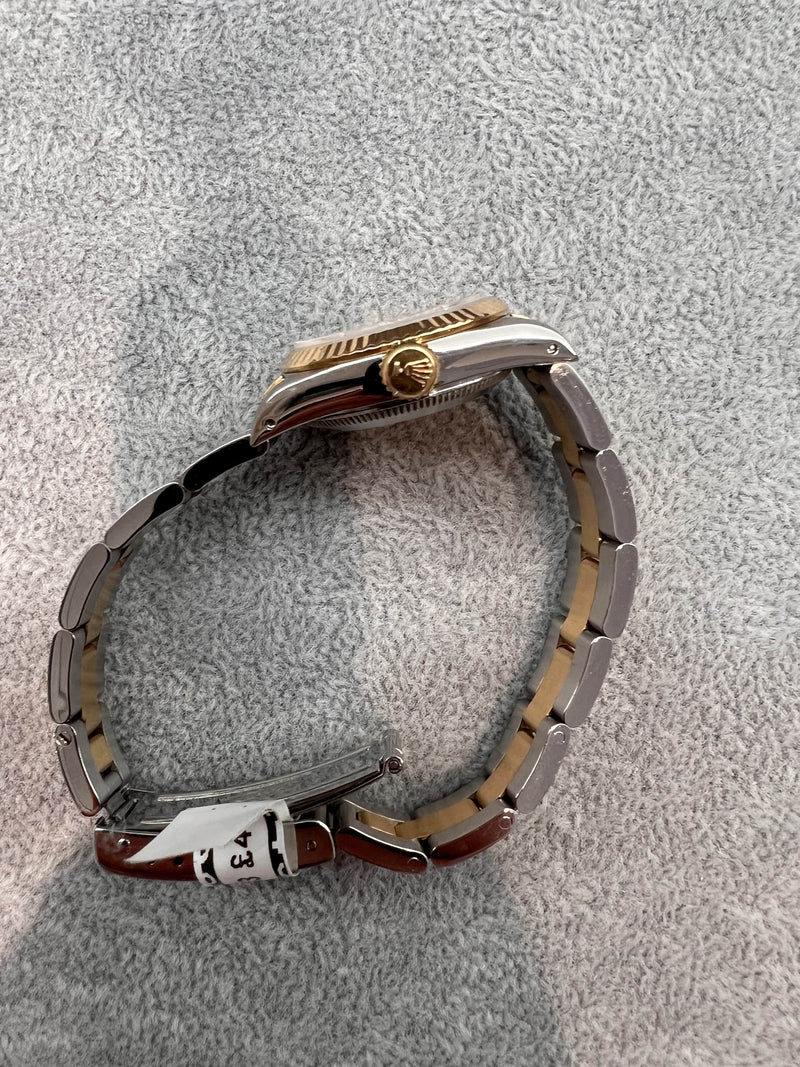 This stunning Lady datejust features a 26mm stainless steel case, champagne dial, 18k yellow gold fluted bezel and a stainless steel and 18k yellow gold oyster bracelet.