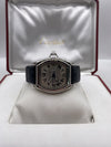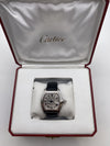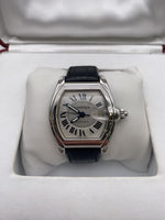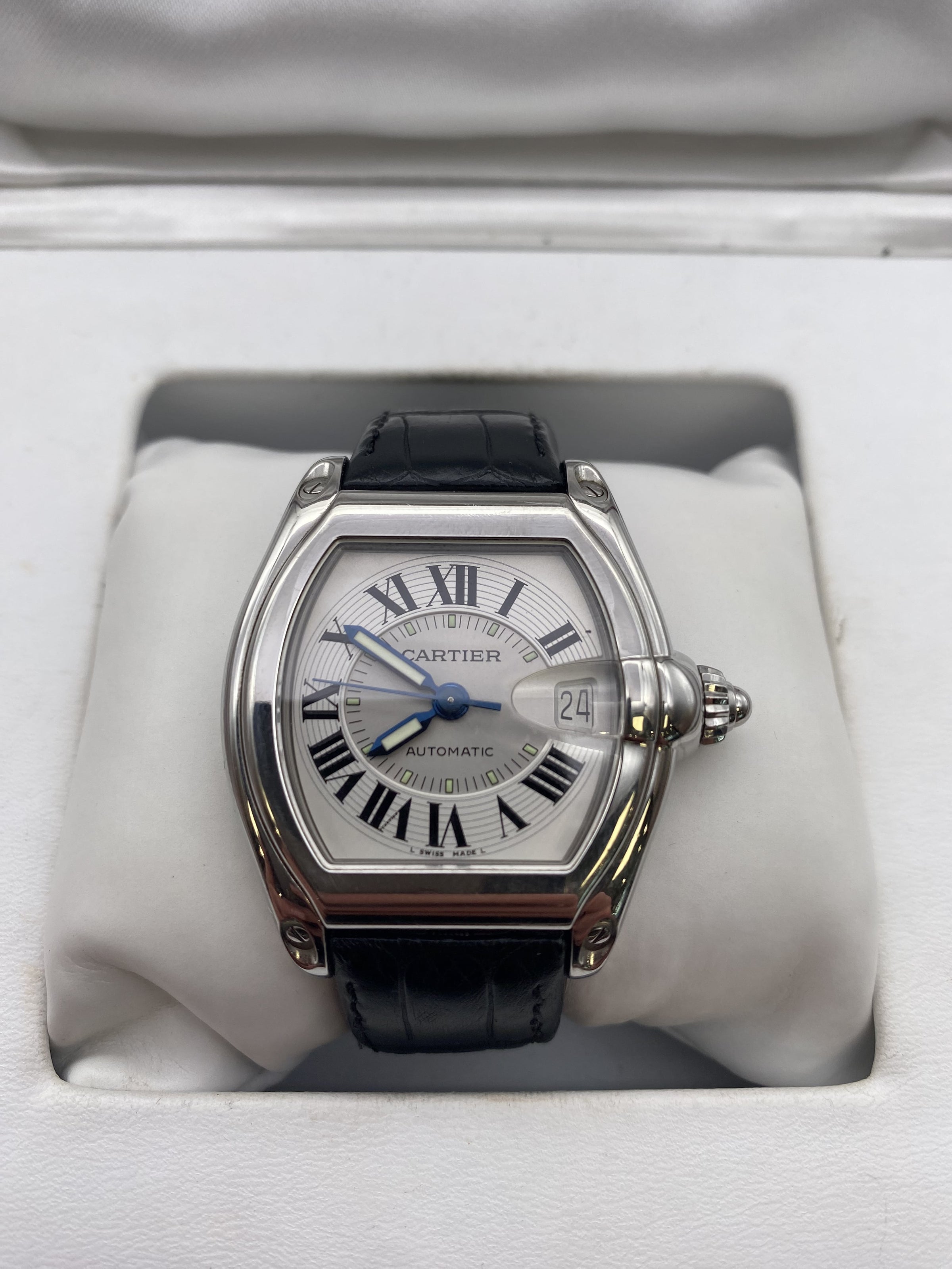 The classic version of the Roadster measures 38 x 43mm, with a silver sunray dial, Roman numerals along a concentric track, luminescent sword-shaped steel hands, and an oversized magnifying lens over the date.