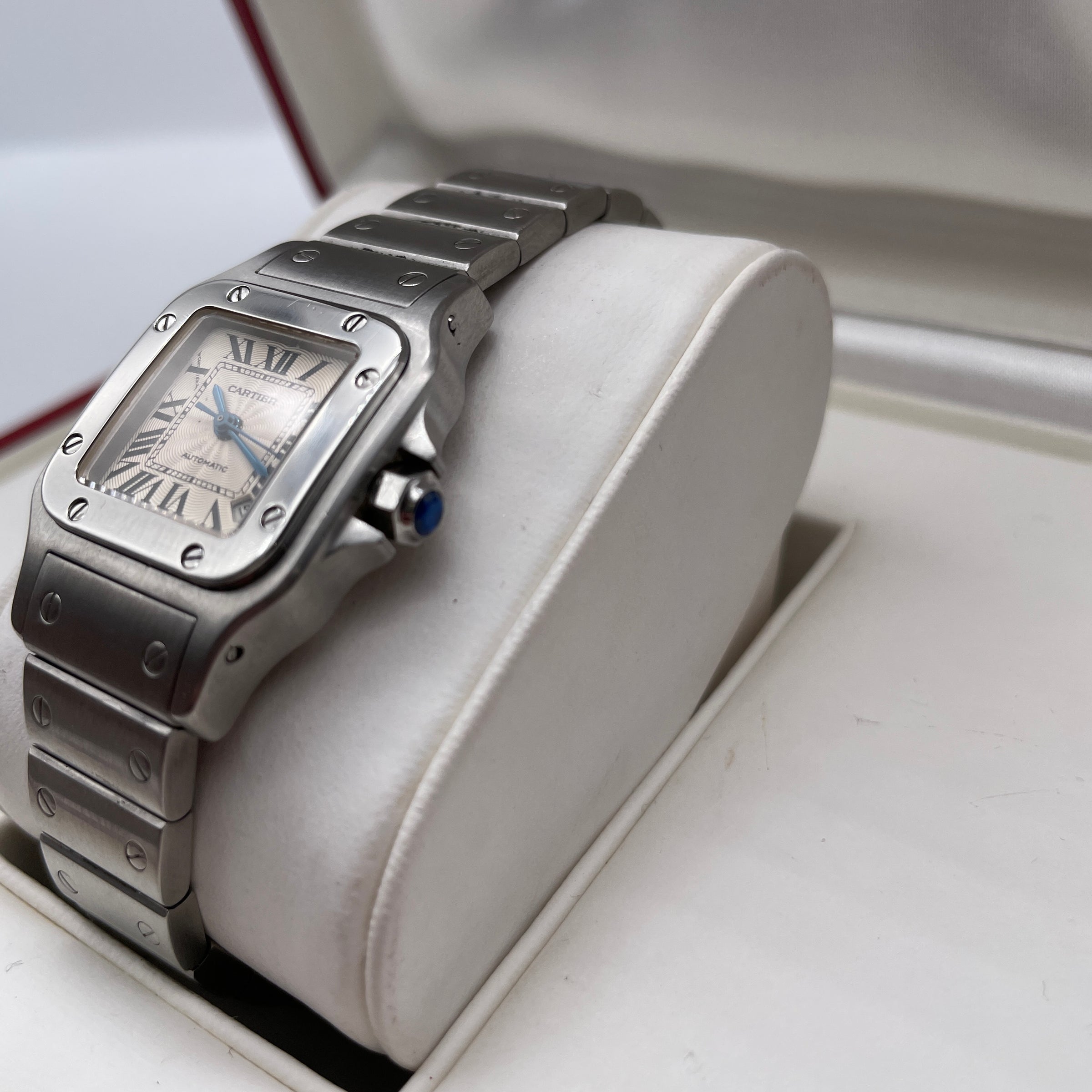 This ladies Cartier Santos size small features a 24mm stainless steel case, stainless steel bezel, white dial with black roman numerals and a stainless steel bracelet with stainless steel screws.
