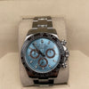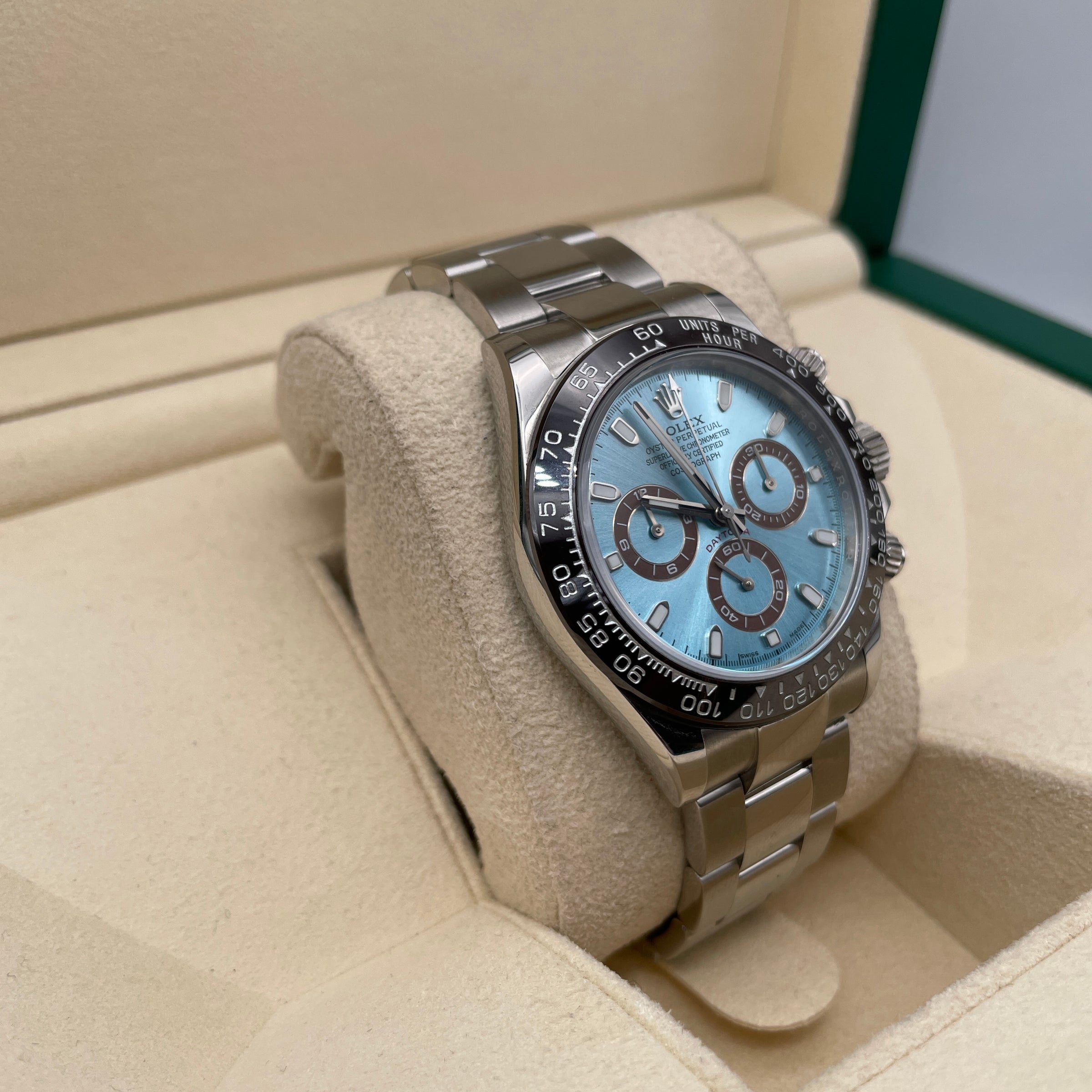 This stainless steel Rolex Daytona 116500LN has been Fitted with a ice blue dial and complimentary brown ceramic bezel to pay homage to the Iconic platinum anniversary Daytona. This watch also comes with the original black black dial and black ceramic bezel.