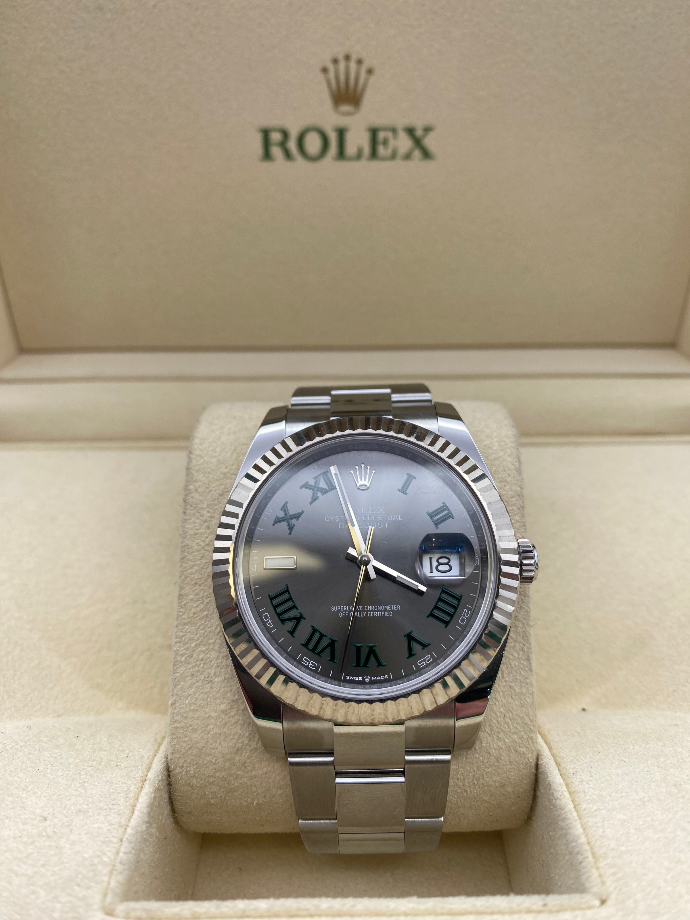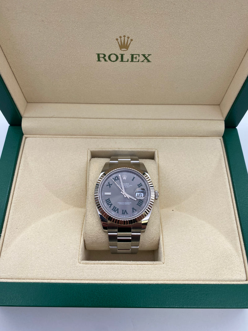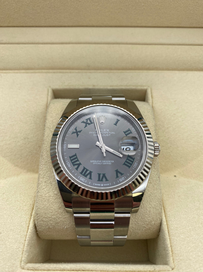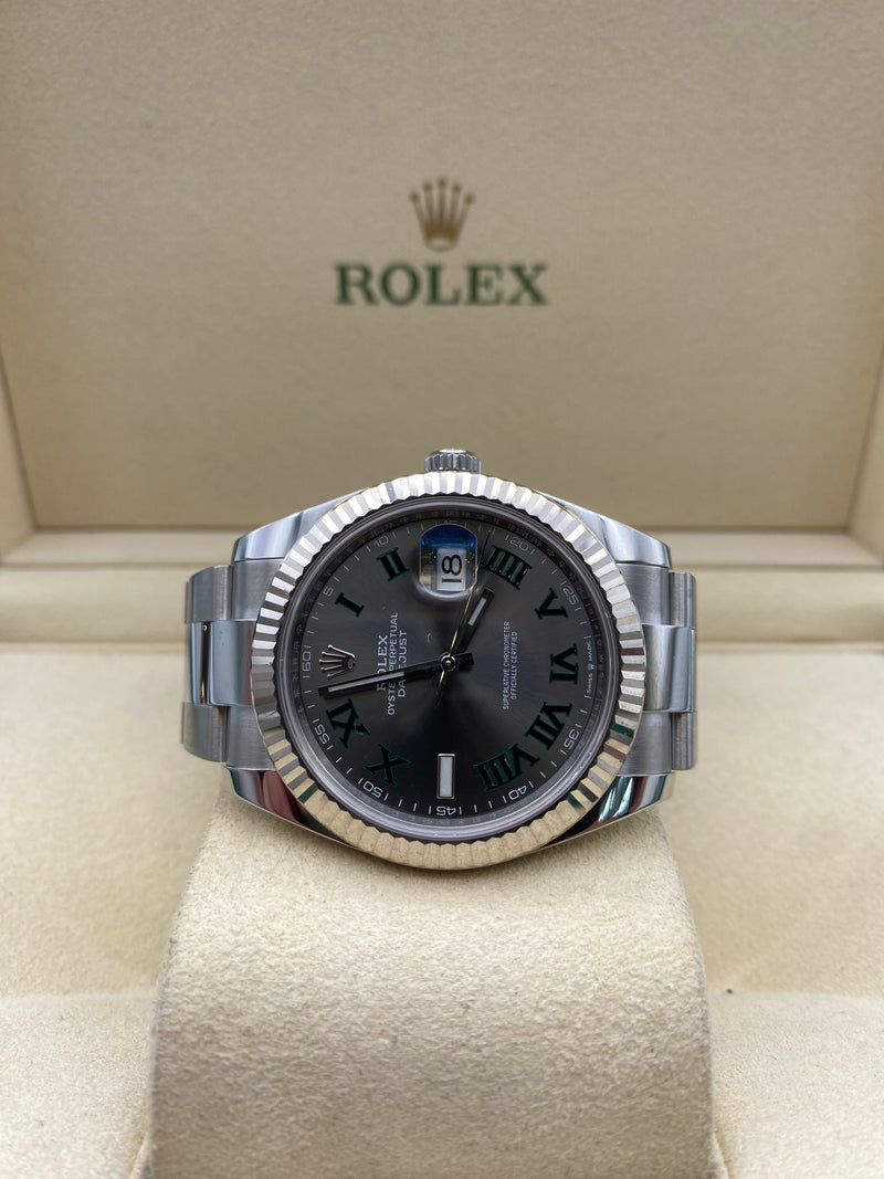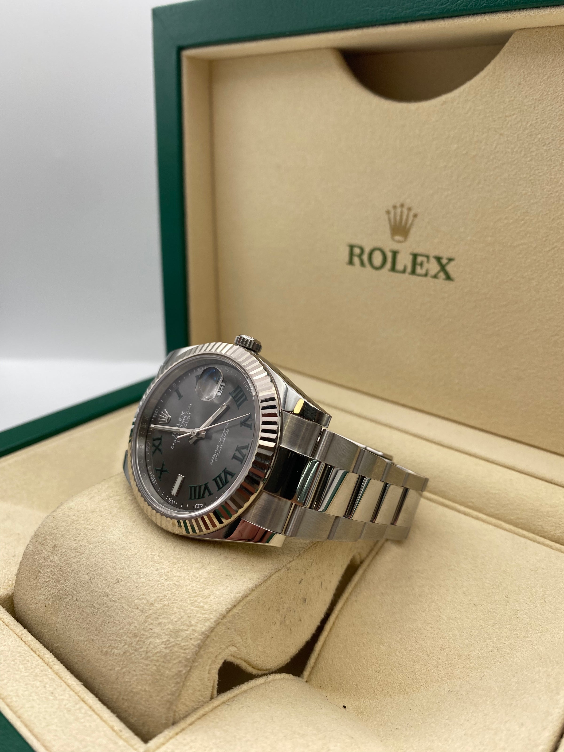 This stunning Rolex Datejust features a 41mm stainless steel case, white gold fluted bezel, grey slate dial with green roman numerals known as the "Wimbledon" dial and a Rolex oyster steel bracelet.
