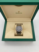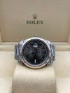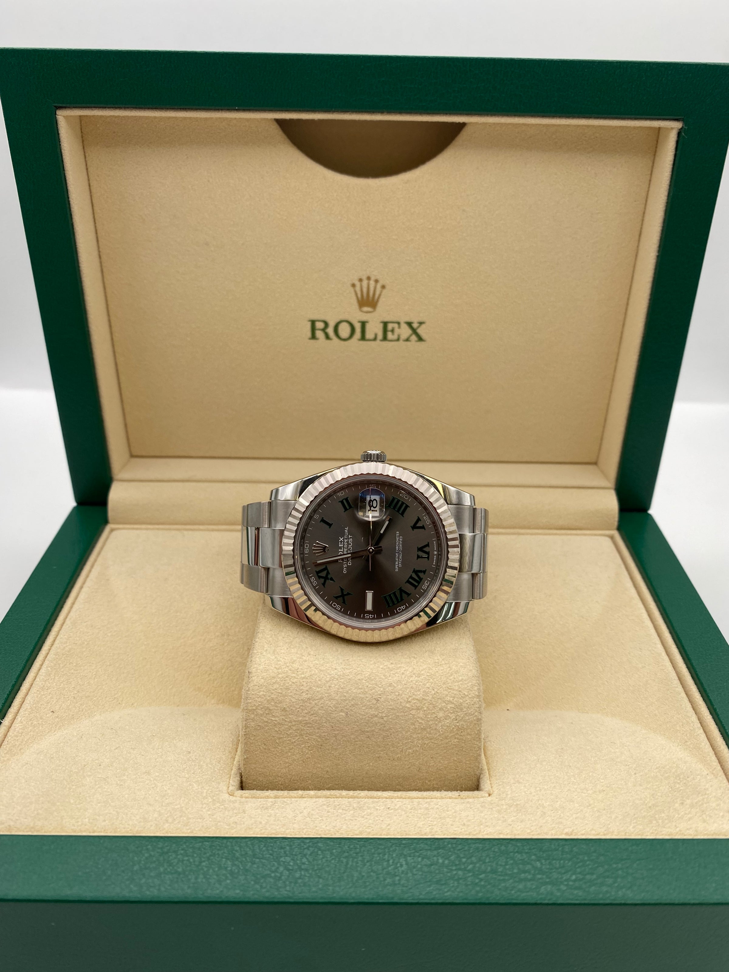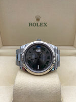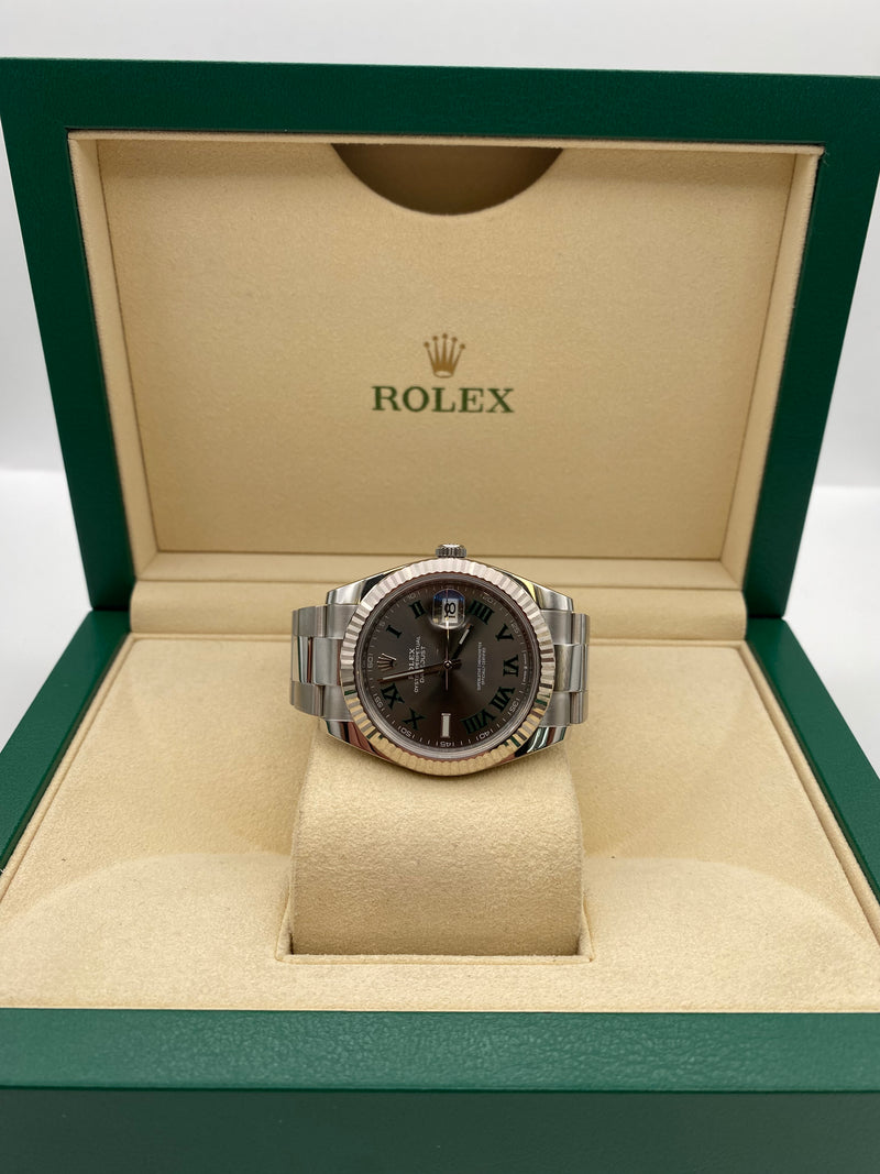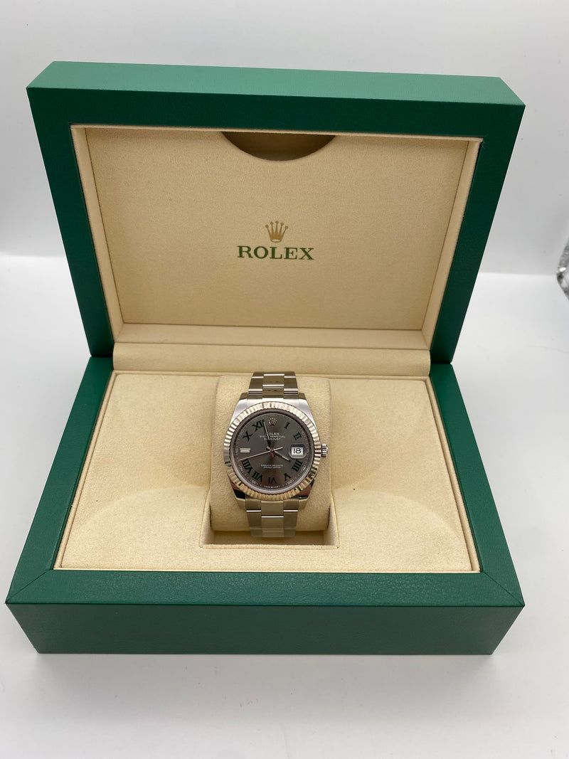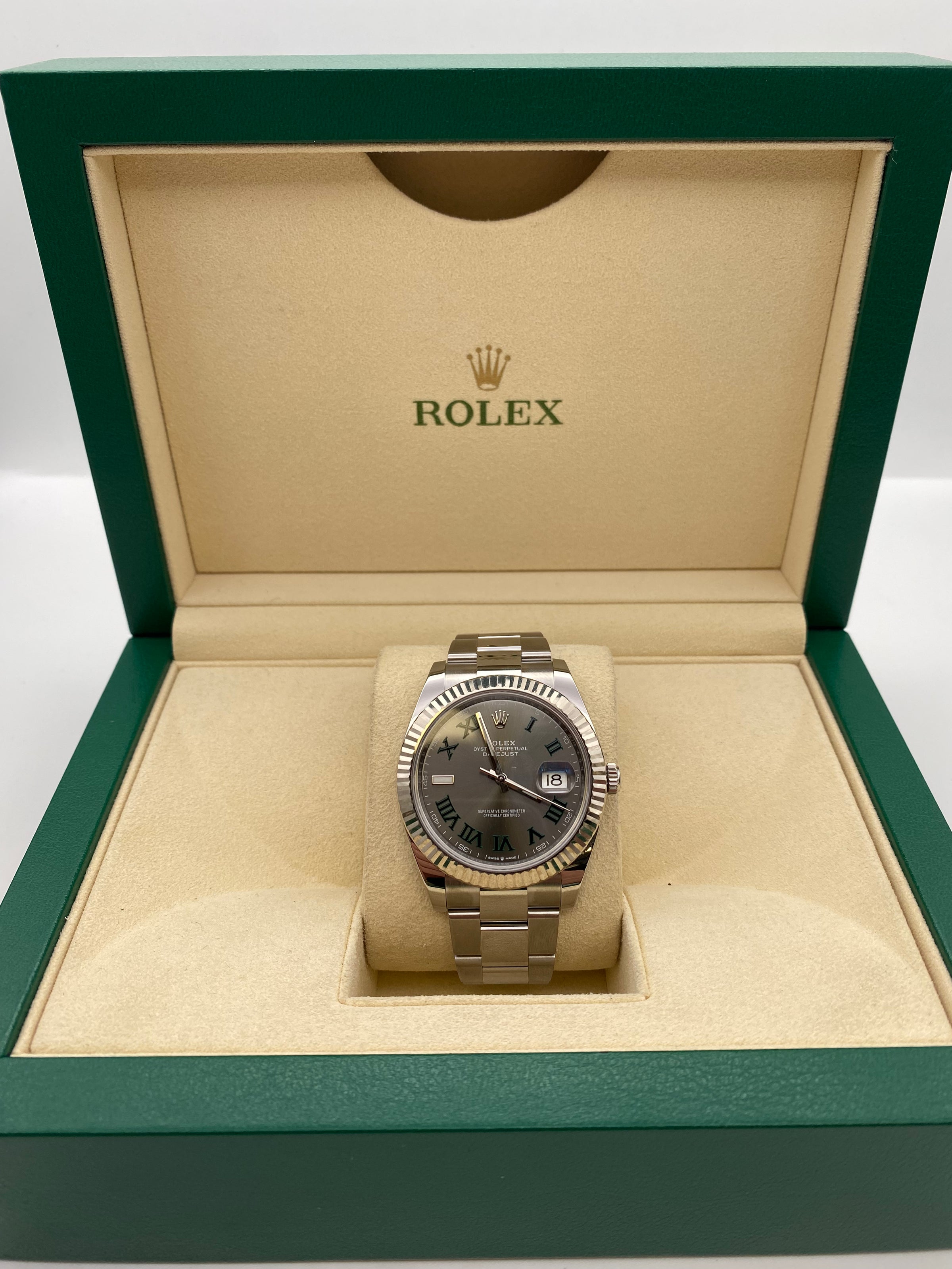 This stunning Rolex Datejust features a 41mm stainless steel case, white gold fluted bezel, grey slate dial with green roman numerals known as the "Wimbledon" dial and a Rolex oyster steel bracelet.