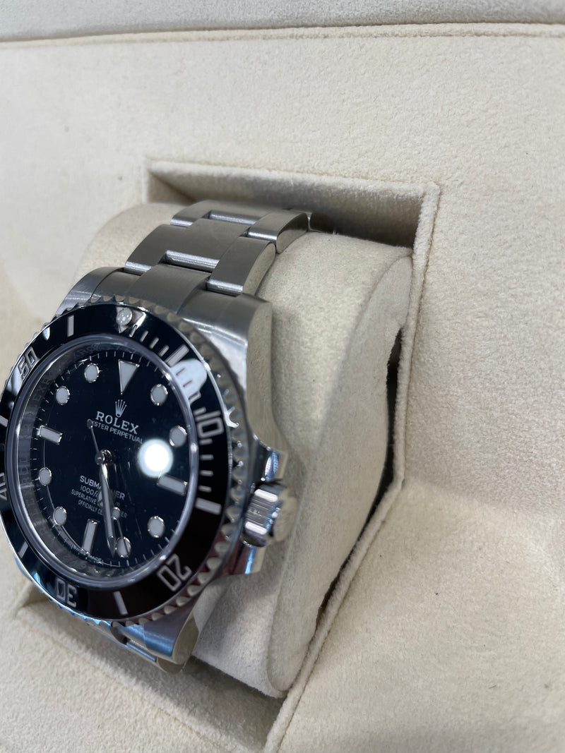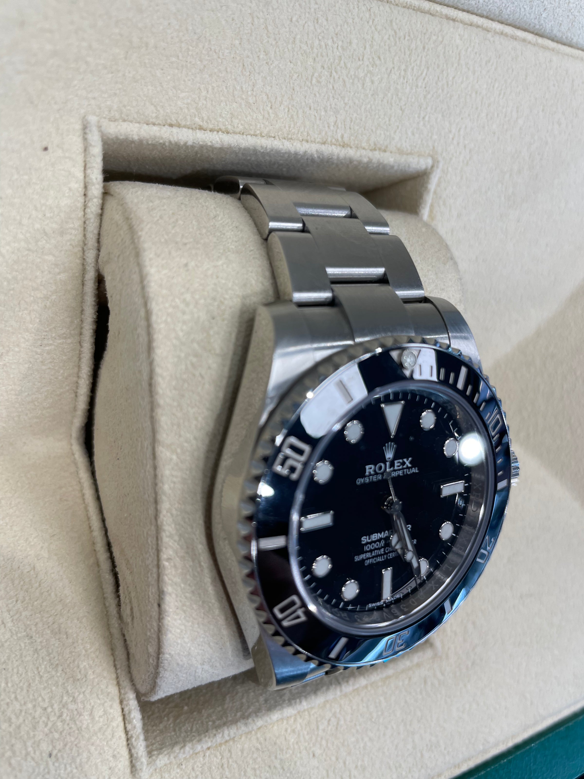 This stainless steel Rolex Submariner non date 40mm features a stainless steel case and bracelet as well as a black dial and black ceramic bezel.