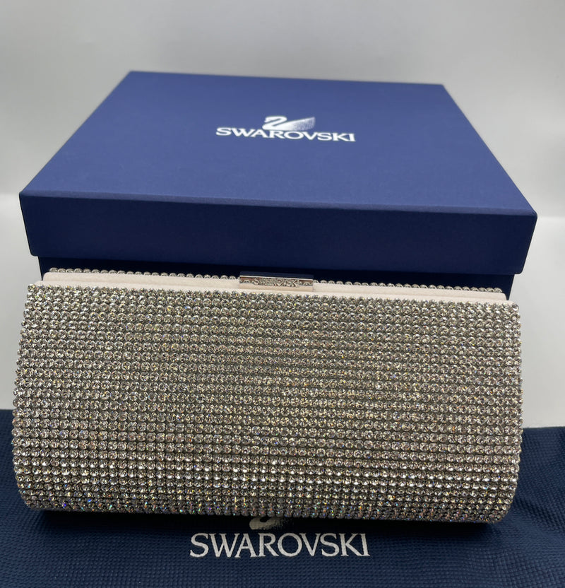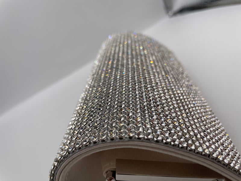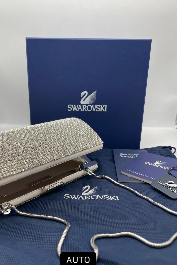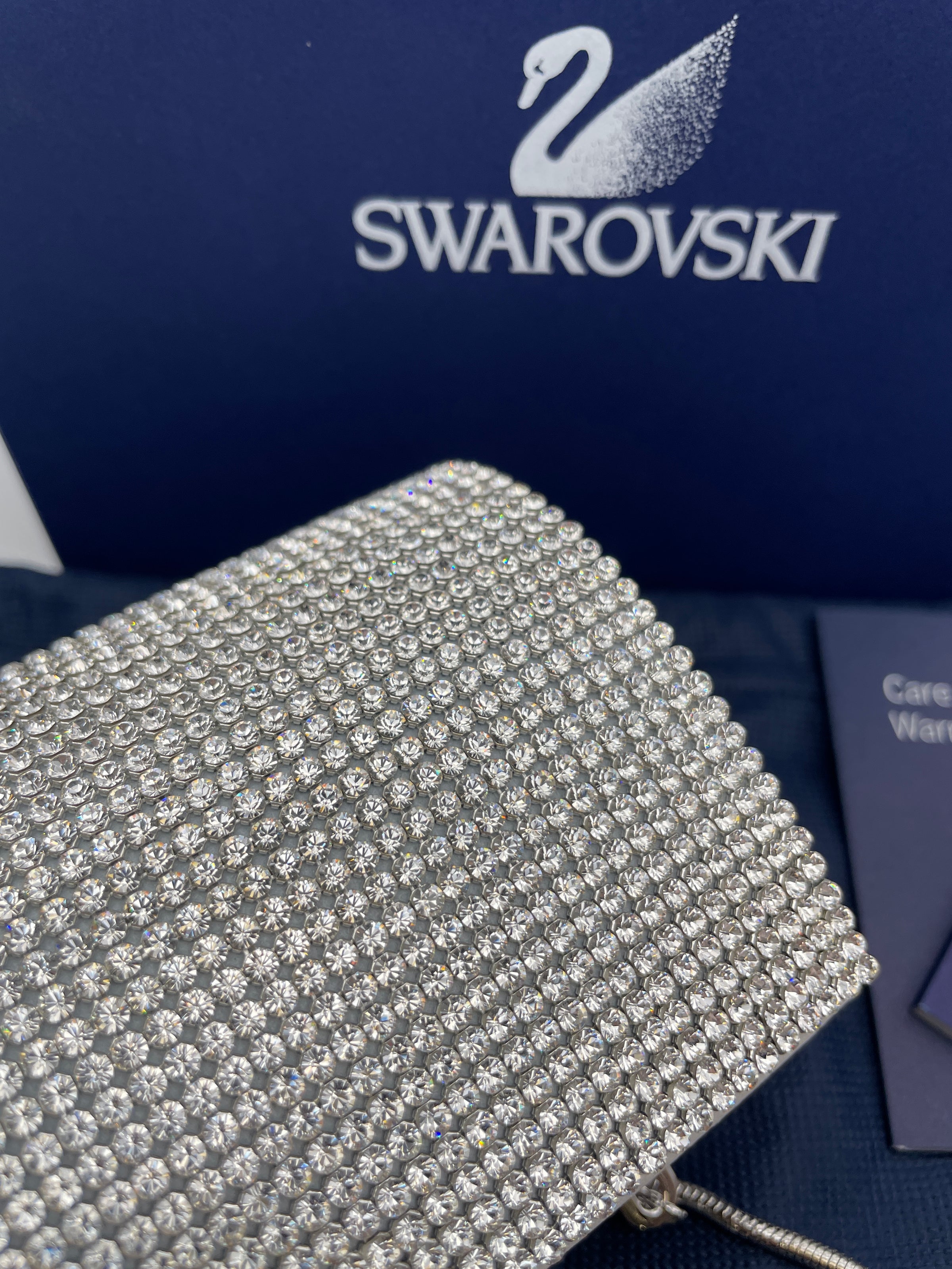 A stunning Swarovski clutch bag, embellished with white Swarovski crystals with a crystal push button opening and detachable silver chain shoulder strap.