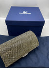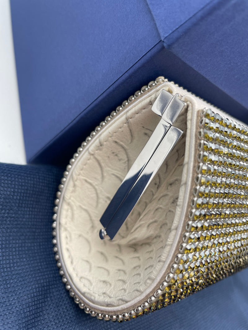 A stunning Swarovski clutch bag, embellished with gold Swarovski crystals with a crystal push button opening and detachable silver chain shoulder strap.