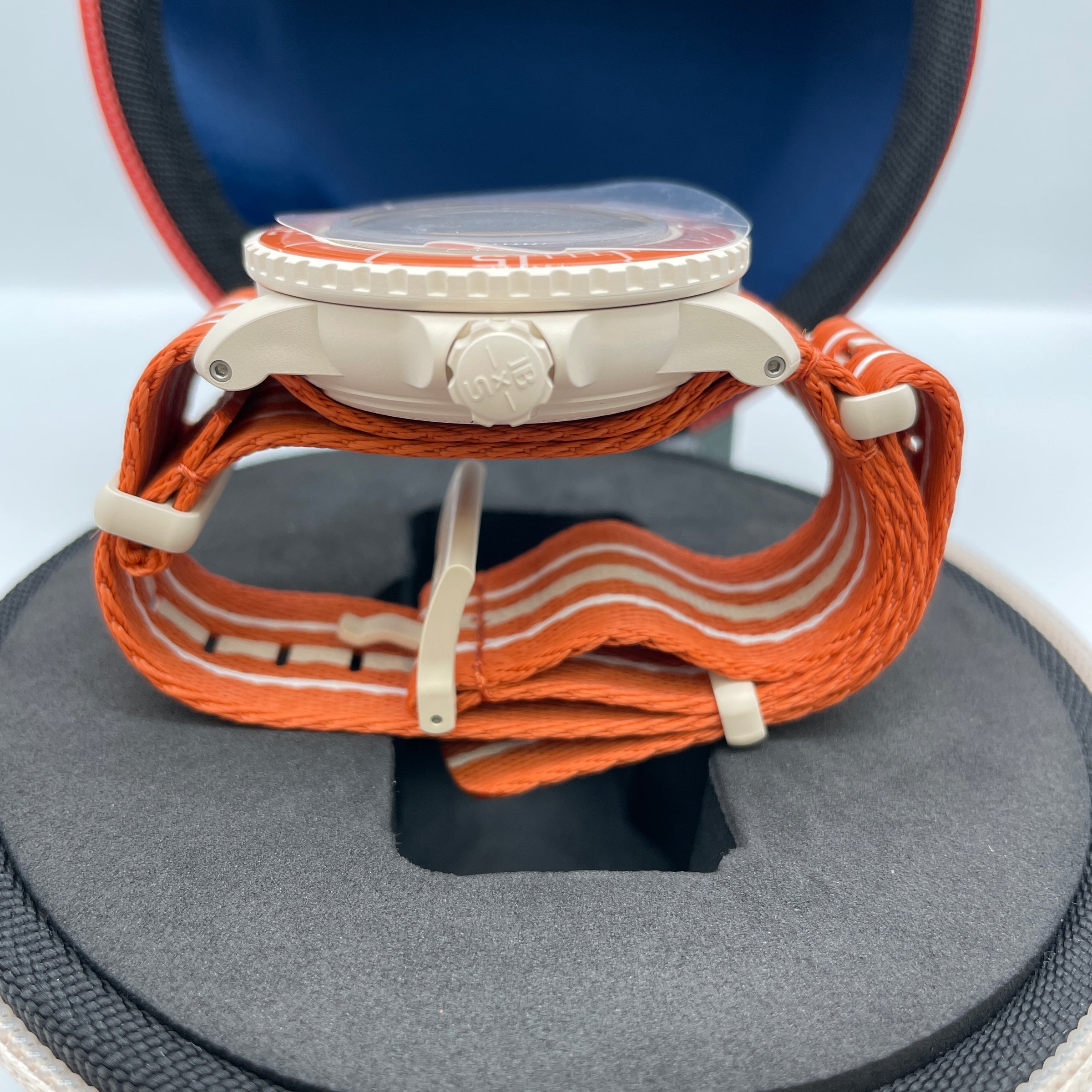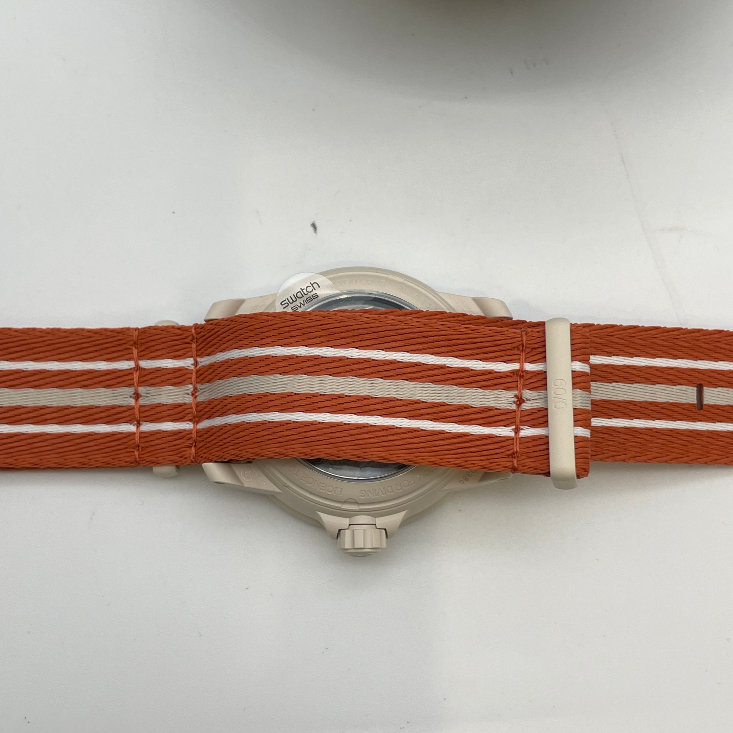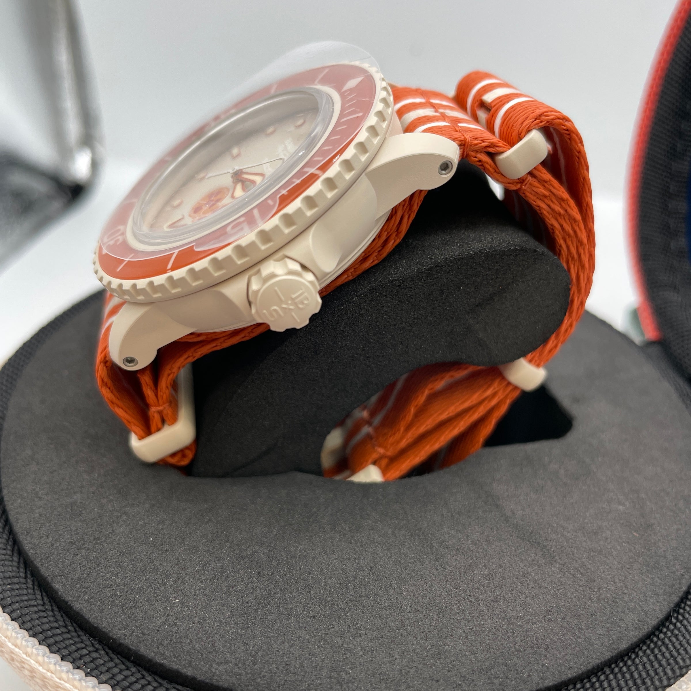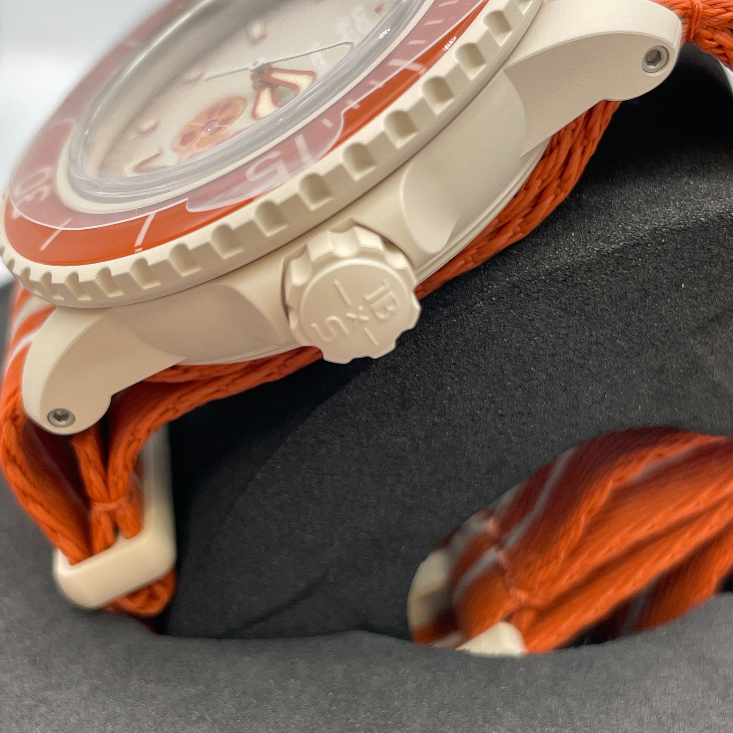 Celebrating the icy waters of the smallest ocean on Earth, the ARCTIC OCEAN model features a special symbol on its contrasting soft beige-coloured dial: a red trefoil on a yellow background with a white cross cutting through it. The words “NO RADIATIONS” placed boldly below the logo are a nod to the legendary Fifty Fathoms heritage and rich history of diver’s watches in the sixties.