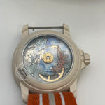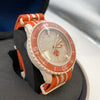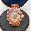 A coveted detail among watch collectors today, this symbol was used by Blancpain when it launched the world’s first ever diver’s watch without radium. The fiery red Dendronotus Frondosus which lends its colours to the NATO strap created from recycled fishing nets, Bioceramic case and gradient dial, features in a beautiful illustration on the back of the timepiece which is equipped with a SISTEM51 movement.