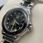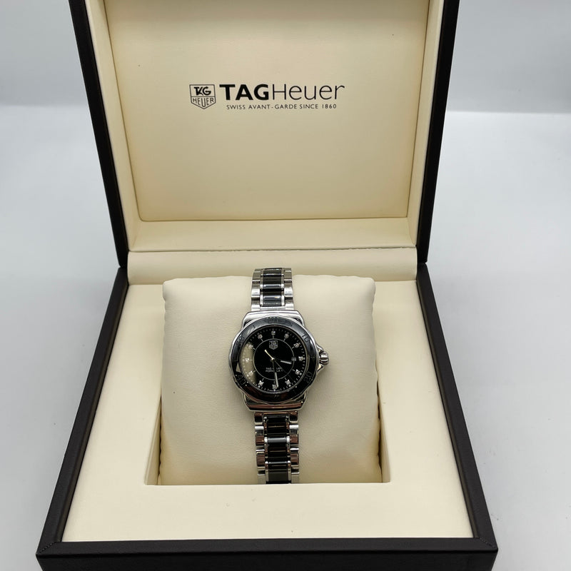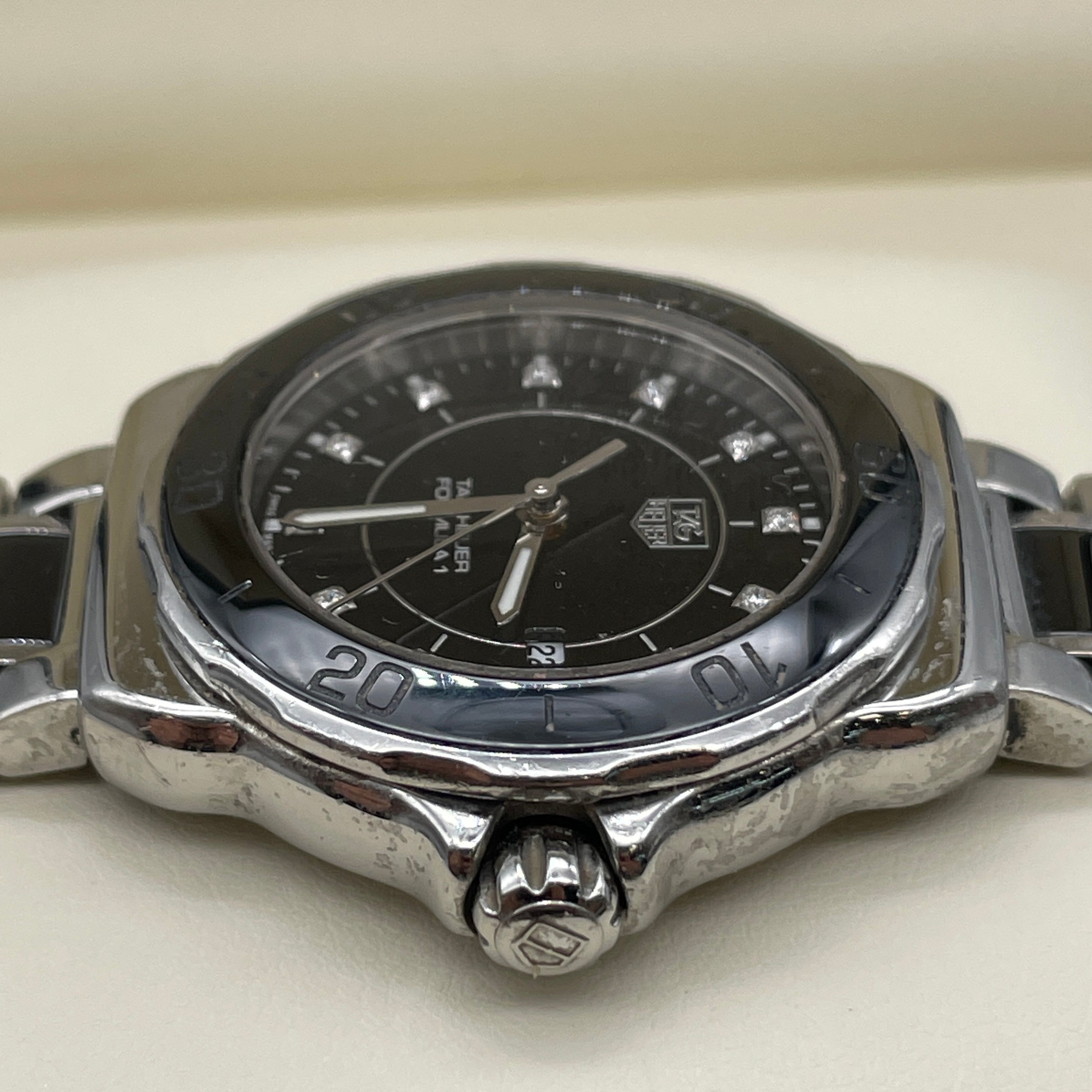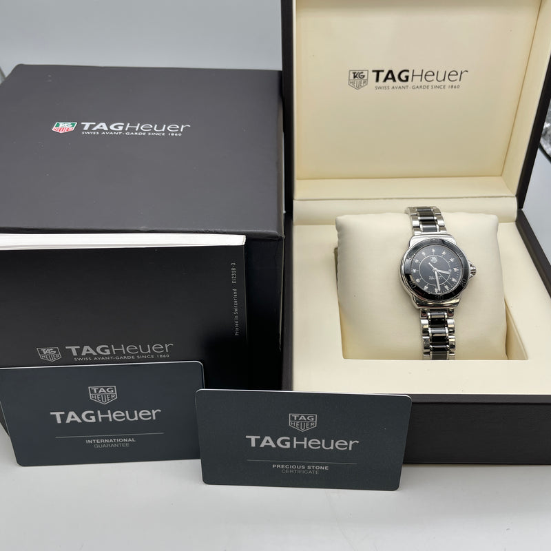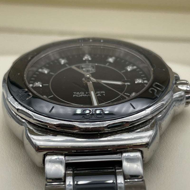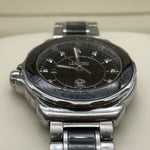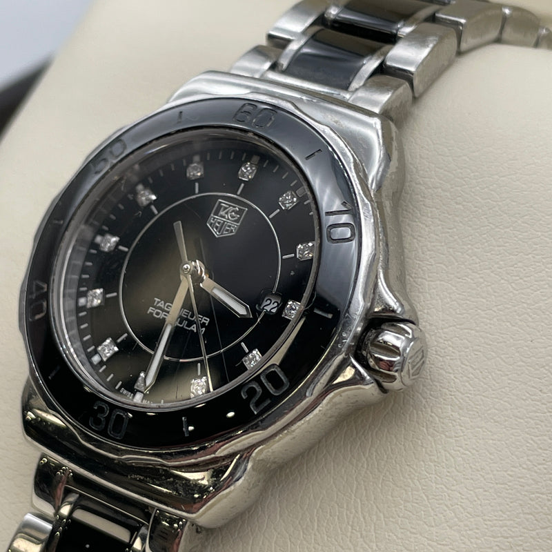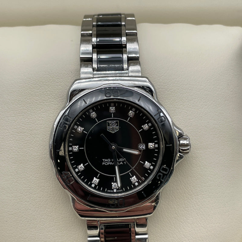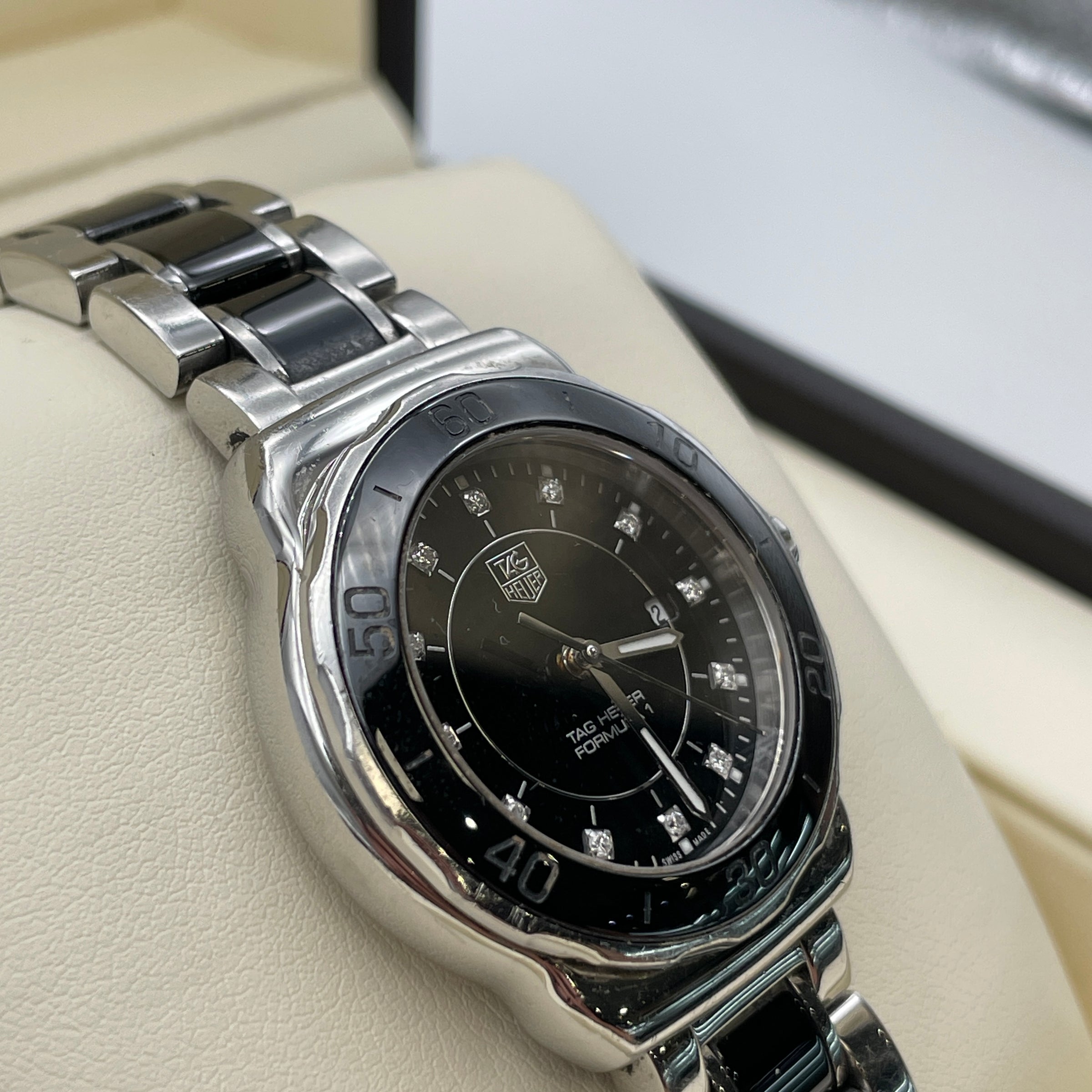 This Pre-Owned TAG Heuer Formula 1 Ladies Watch WBJ141AB.BA0973 features a 32mm stainless steel case fitted with a black dial, diamond dot hour markers, sapphire crystal glass, and a date complication. Powered by a quartz movement, this stunning timepiece is on a stainless steel and ceramic bracelet finished with a folding clasp for added security and is water resistant to 100 metres.