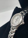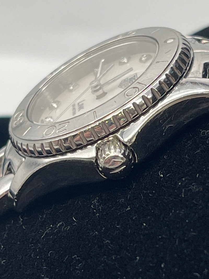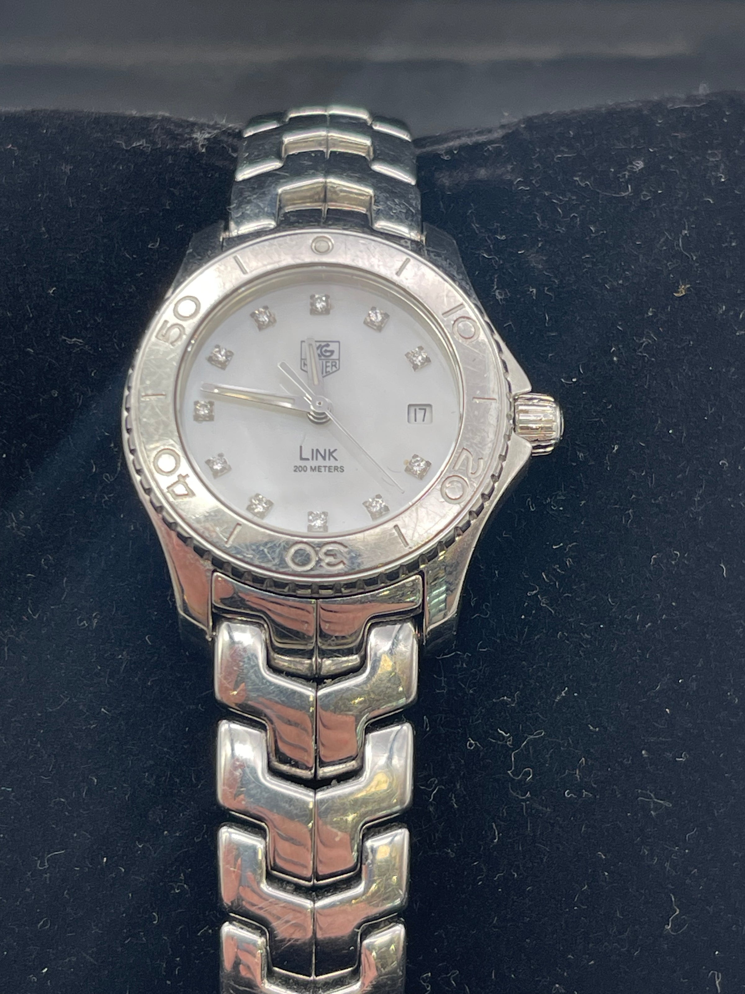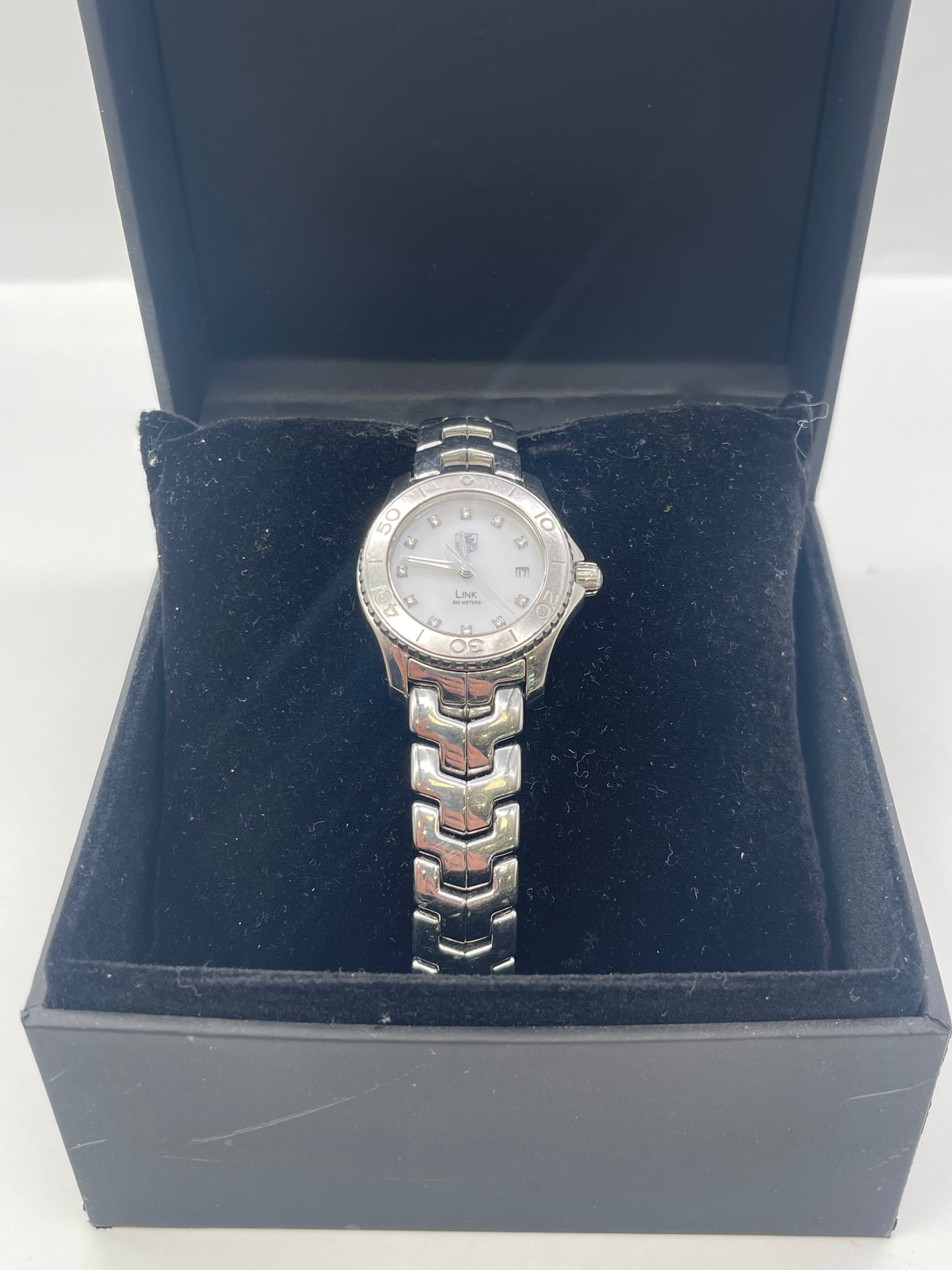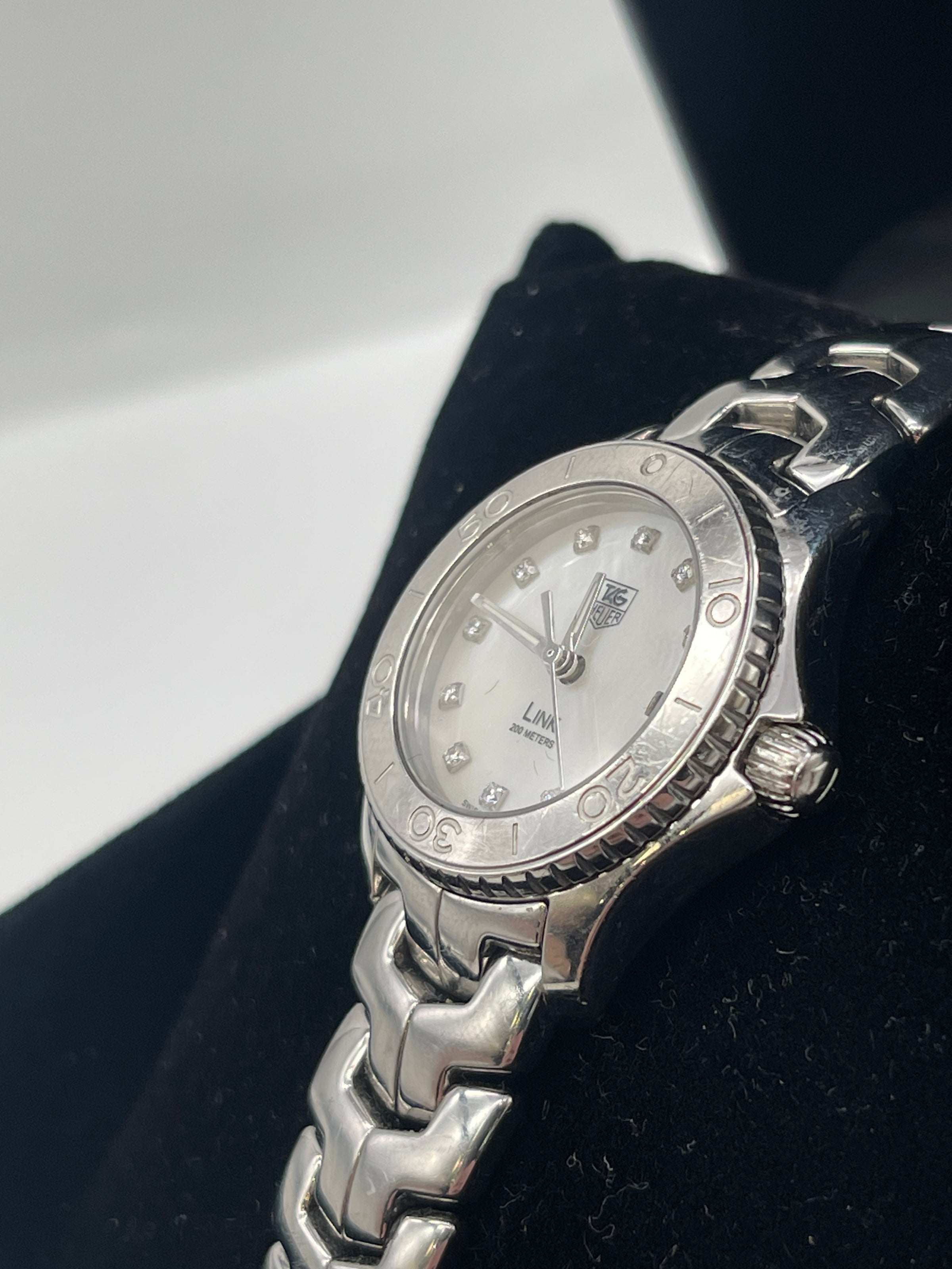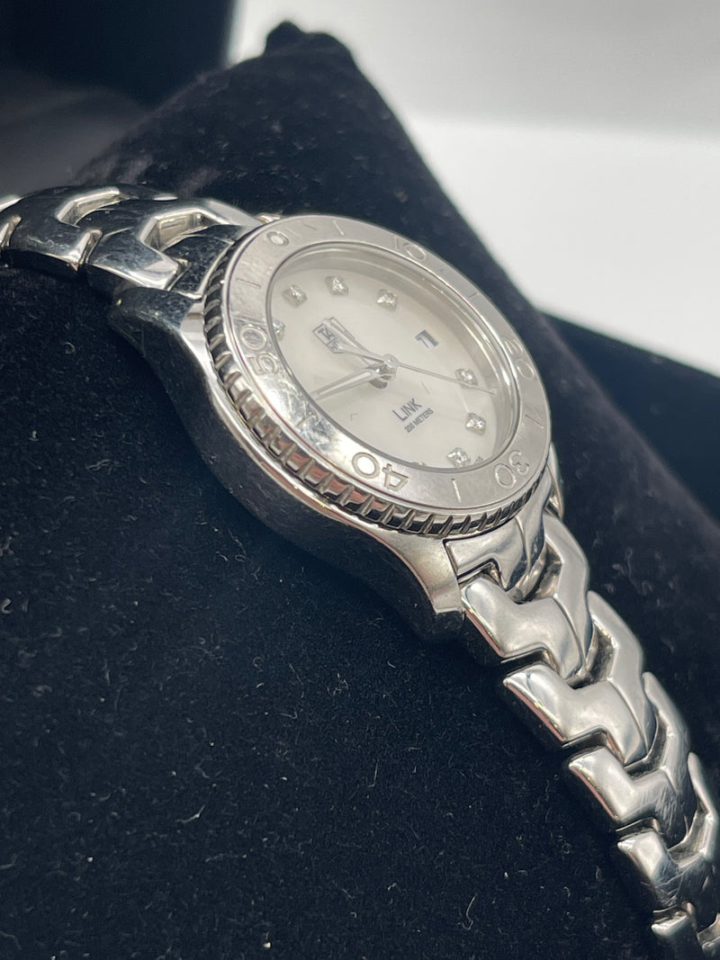 The TAG Heuer Link Lady Quartz is a sophisticated timepiece that seamlessly blends elegance with functionality. Featuring a 32mm stainless steel case, this watch showcases a white mother-of-pearl dial adorned with 12 diamond hour markers totaling 0.116 carats. The iconic S-shaped bracelet, crafted from fine-brushed and polished stainless steel, ensures both comfort and style. Powered by a precise Swiss quartz movement, the watch offers reliable timekeeping and includes a date display at the 3 o'clock position. With a water resistance of up to 100 meters, it is suitable for daily wear and occasional swimming.