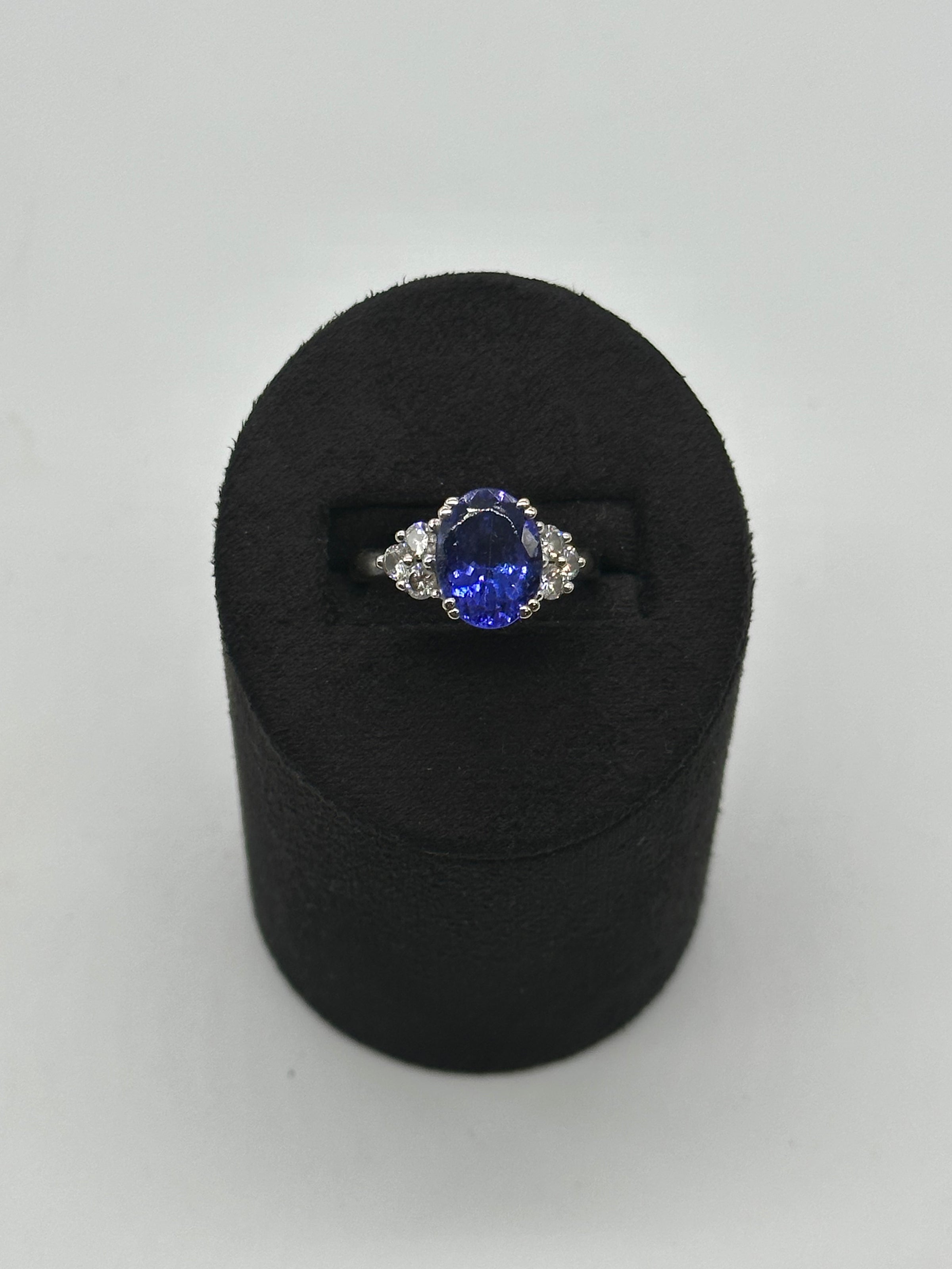 This stunning 18ct white gold Tanzanite and Diamond ring is set with oval cut tanzanite with three brilliant cut diamonds set on each shoulder in a claw setting.