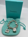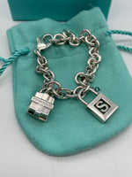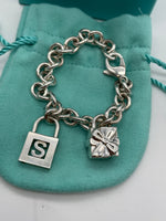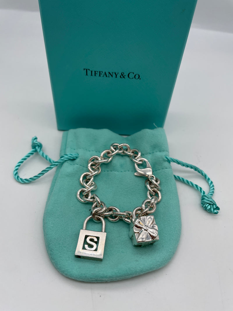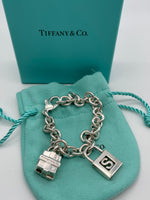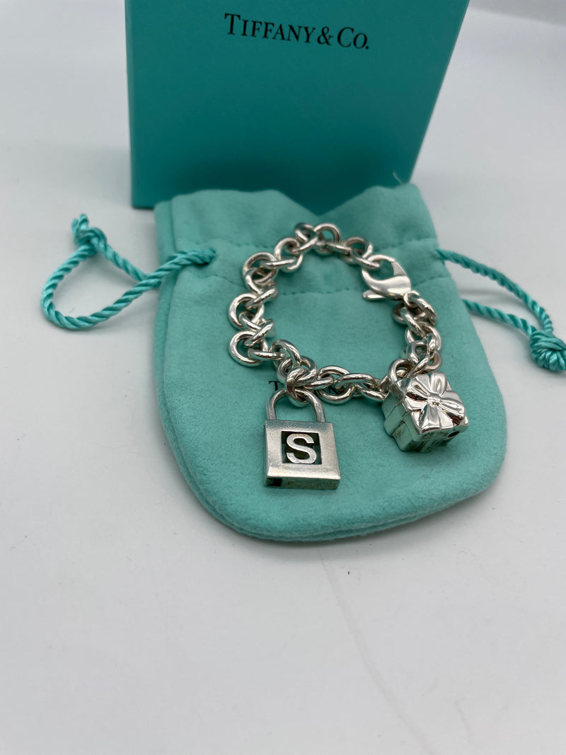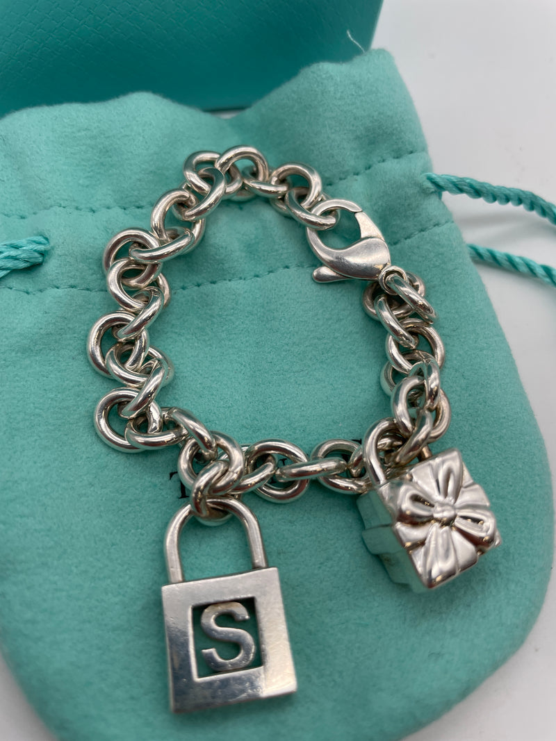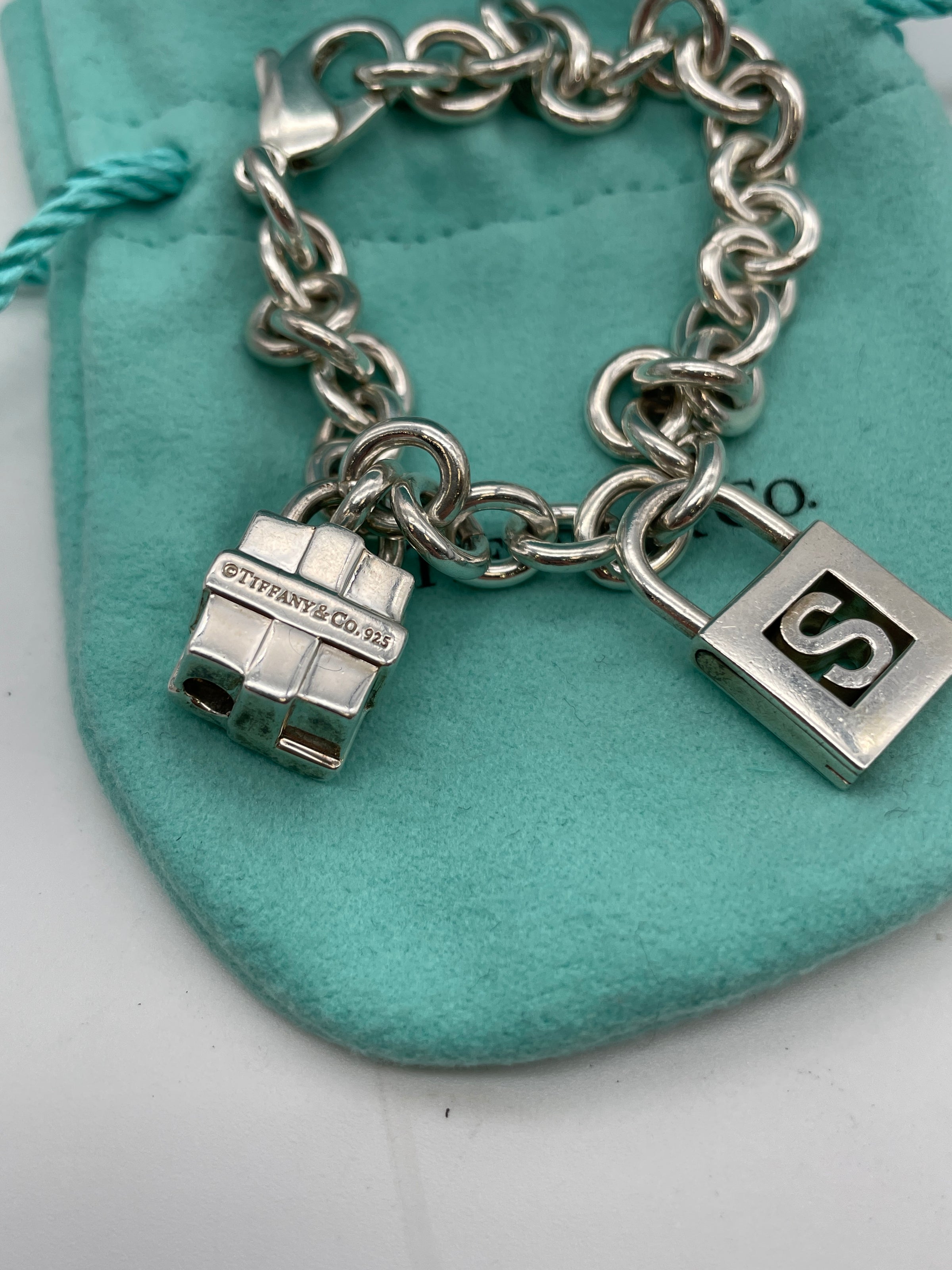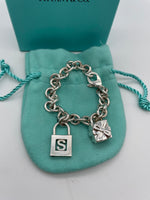 Inspired by a keyring we debuted in 1969, the Return to Tiffany collection is famous for its signature motif. This sterling silver bracelet reinvents the classic design by adding a range of unique charms, on this bracelet in particular there is a small gift charm and a letter S padlock.