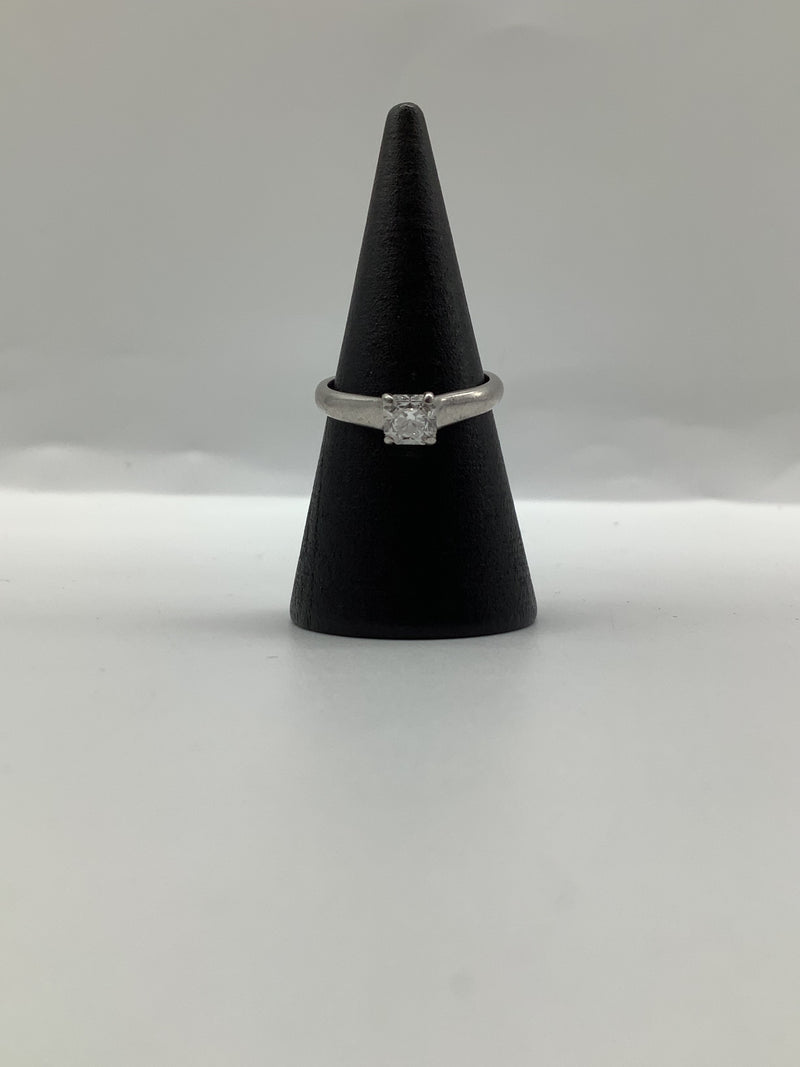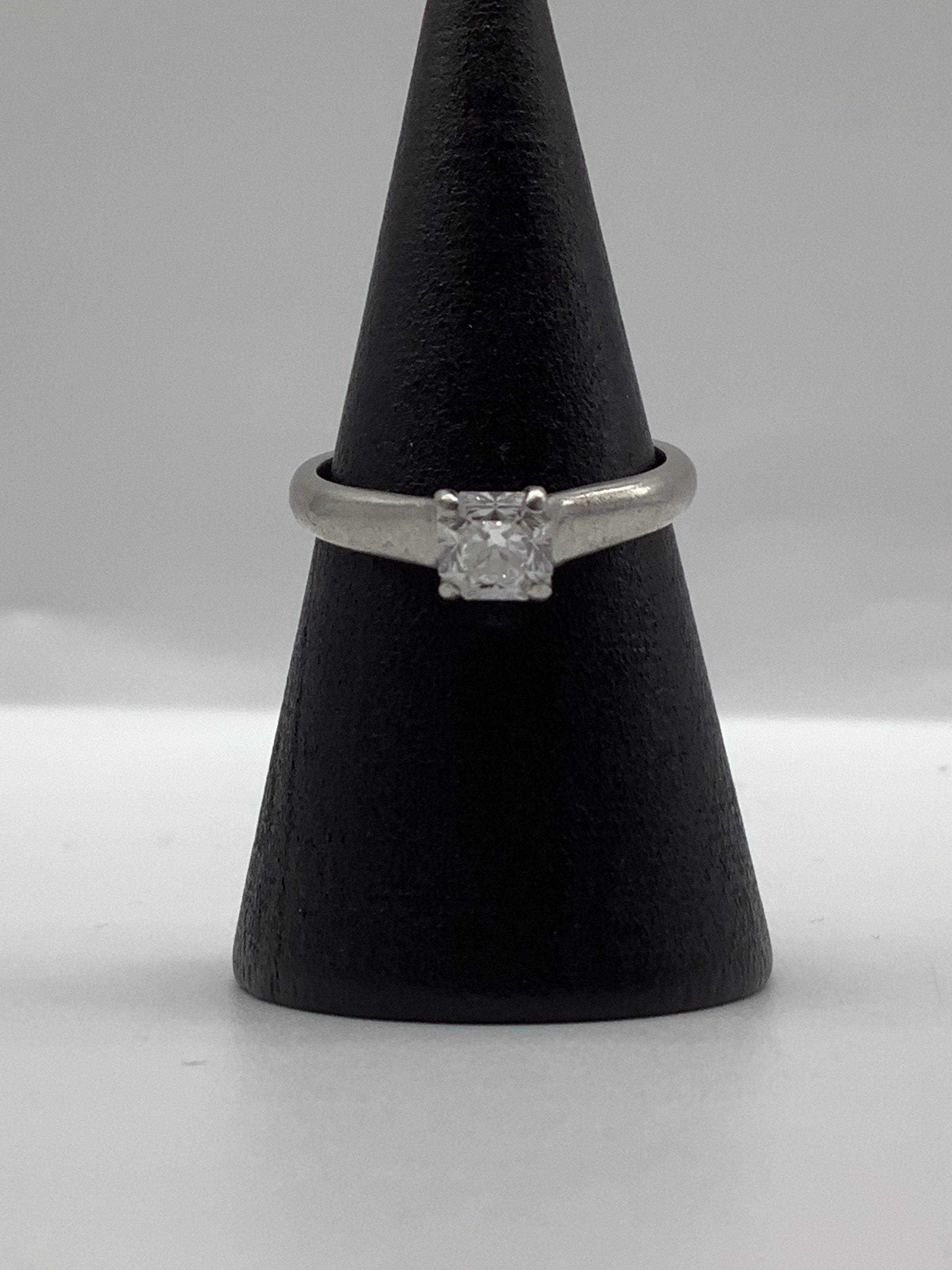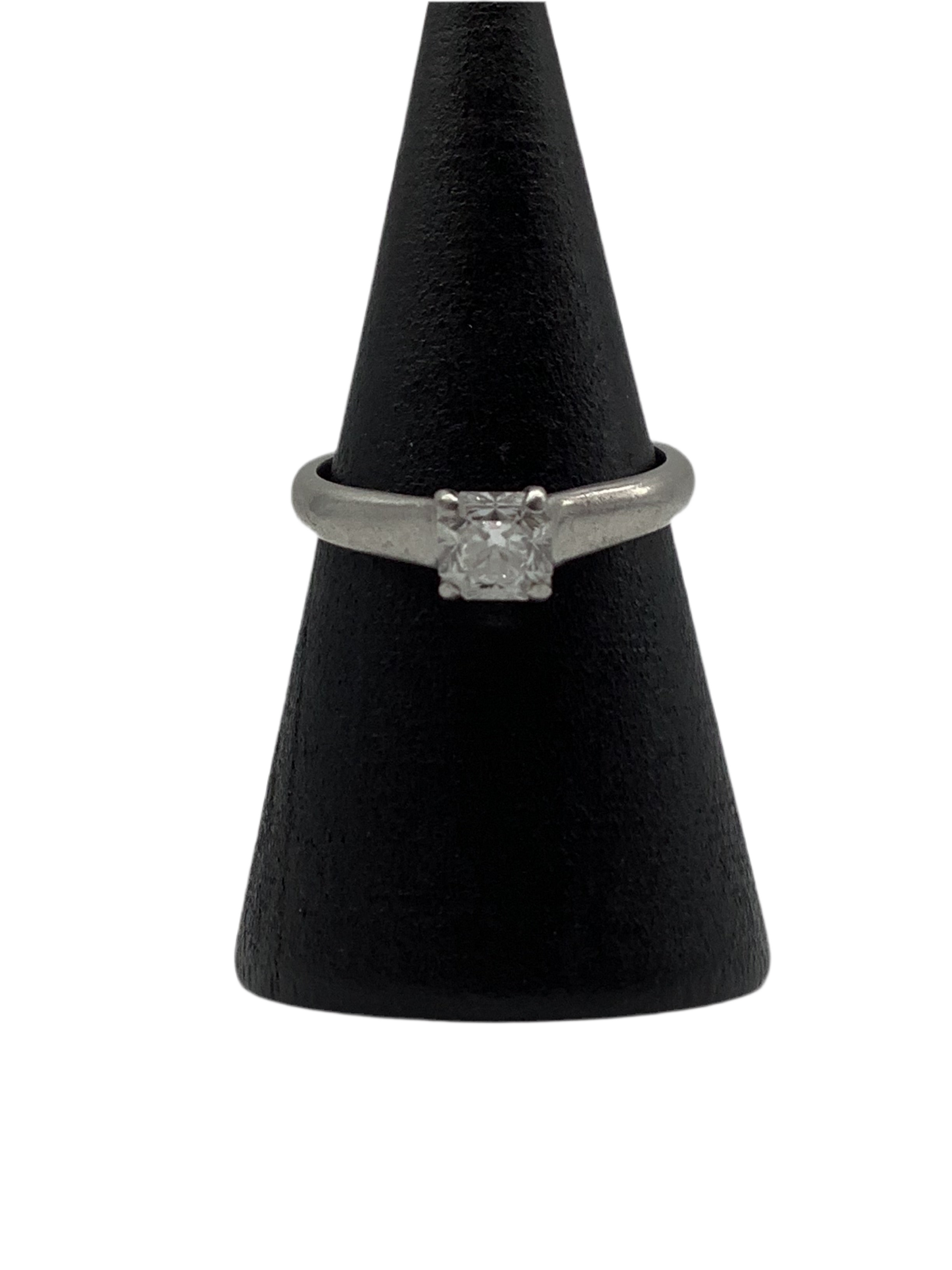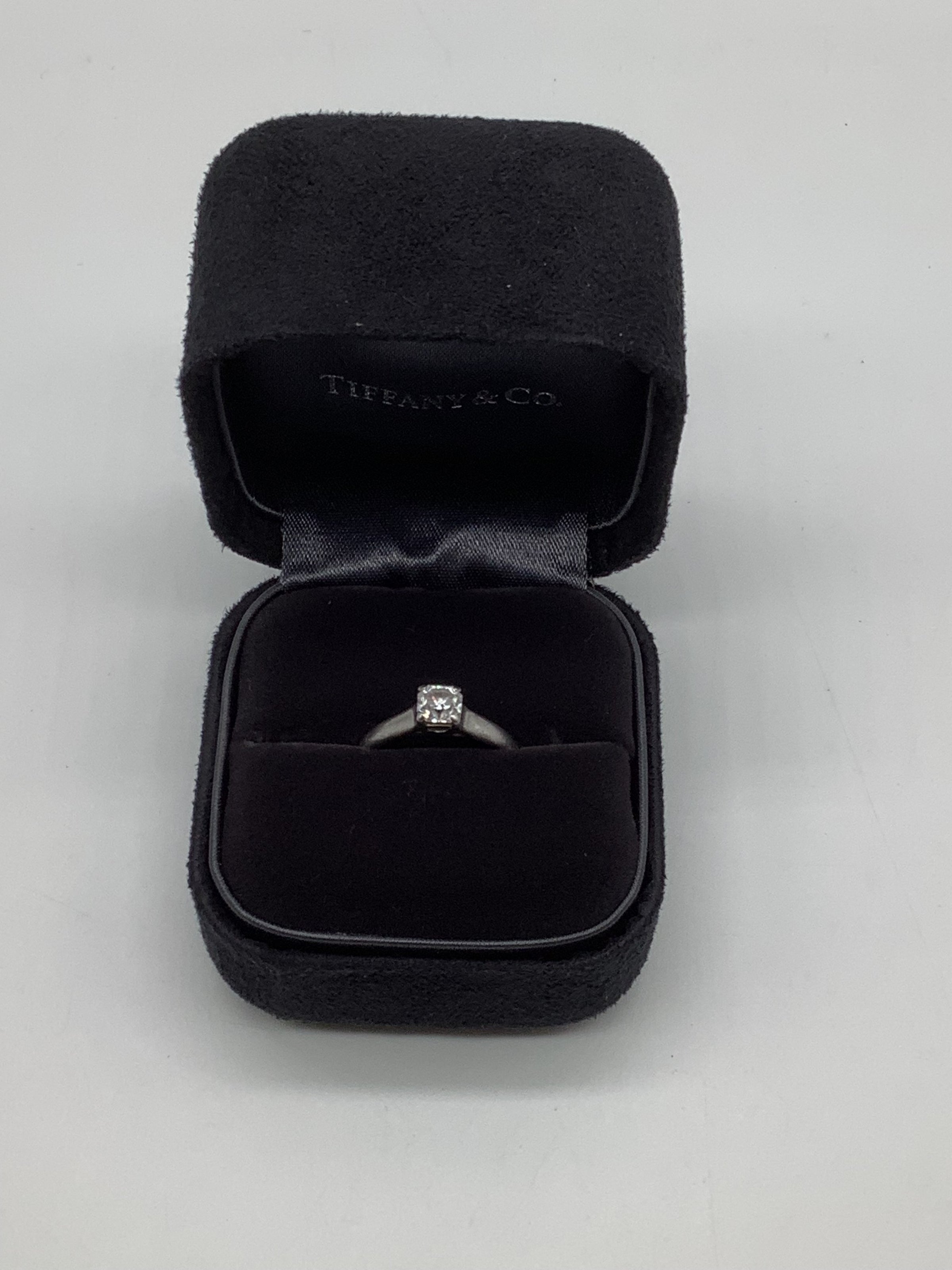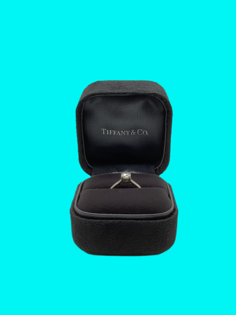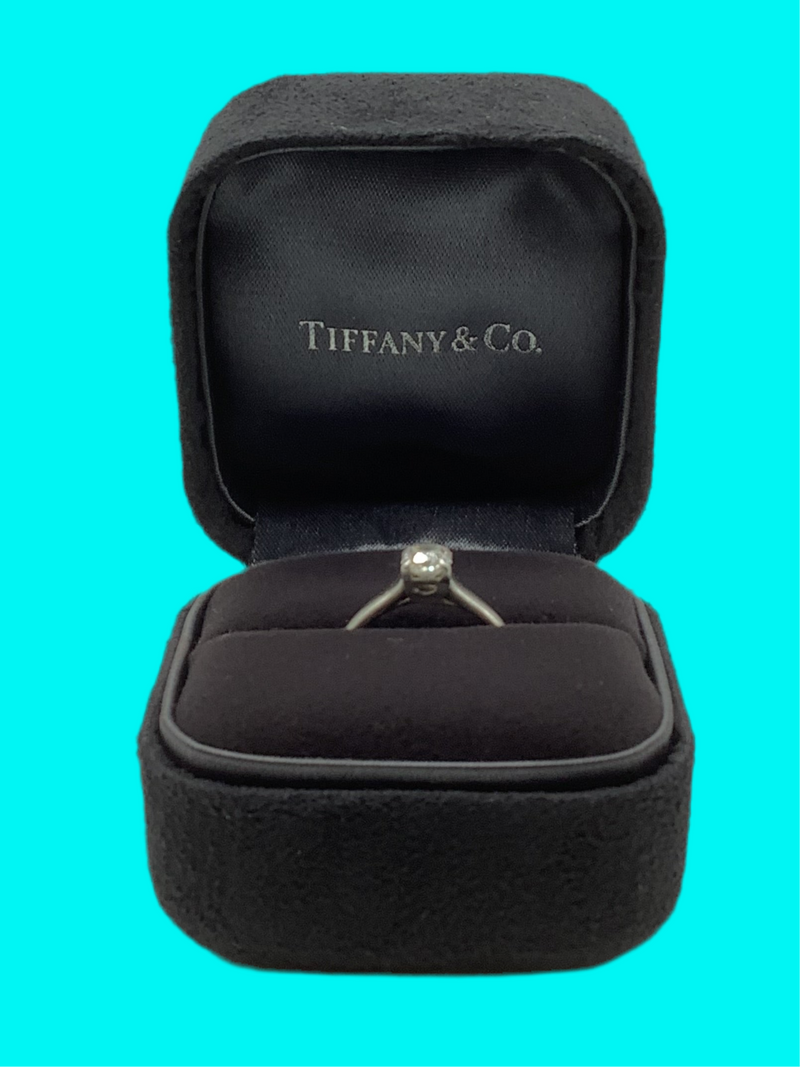 Presenting the Tiffany & Co. Diamond Solitaire Ring – a refined expression of timeless elegance. Crafted in platinum, the ring showcases a 0.50ct round brilliant-cut diamond, celebrated for its superior sparkle and fire. Set in Tiffany’s signature six-prong setting, the design lifts the diamond above the band to allow maximum light to pass through, enhancing its brilliance. This piece is accompanied by its original inner and outer Tiffany boxes, adding to its collectability and charm. -