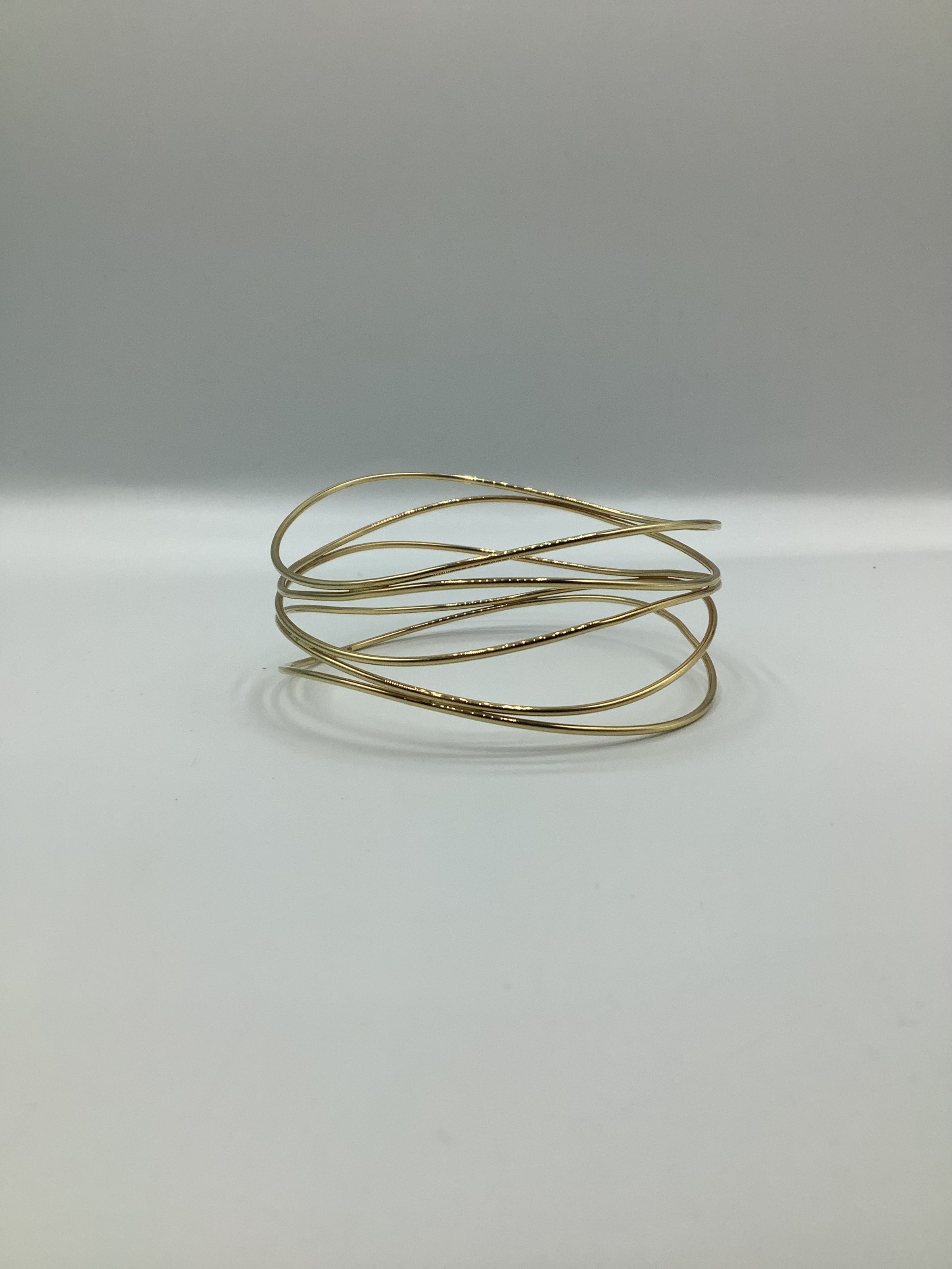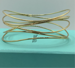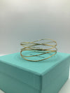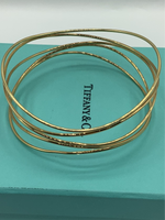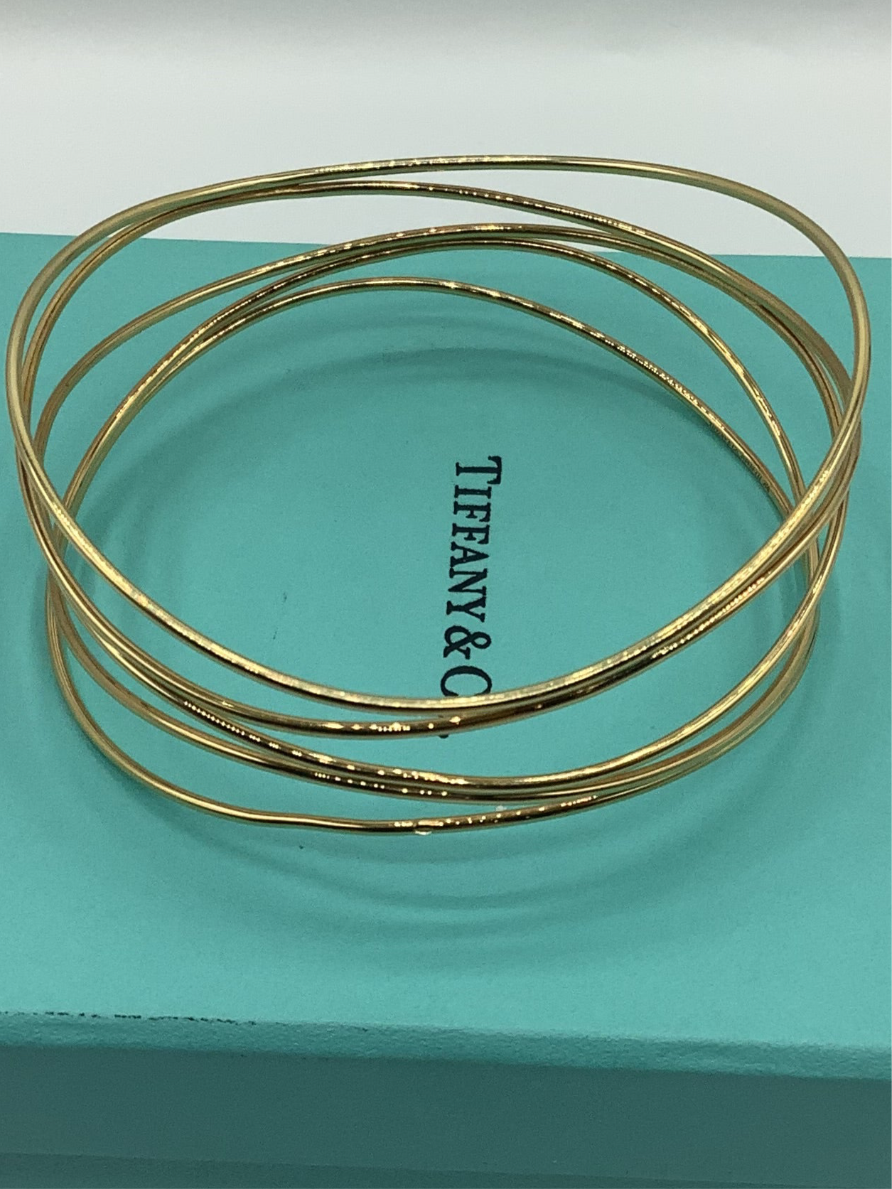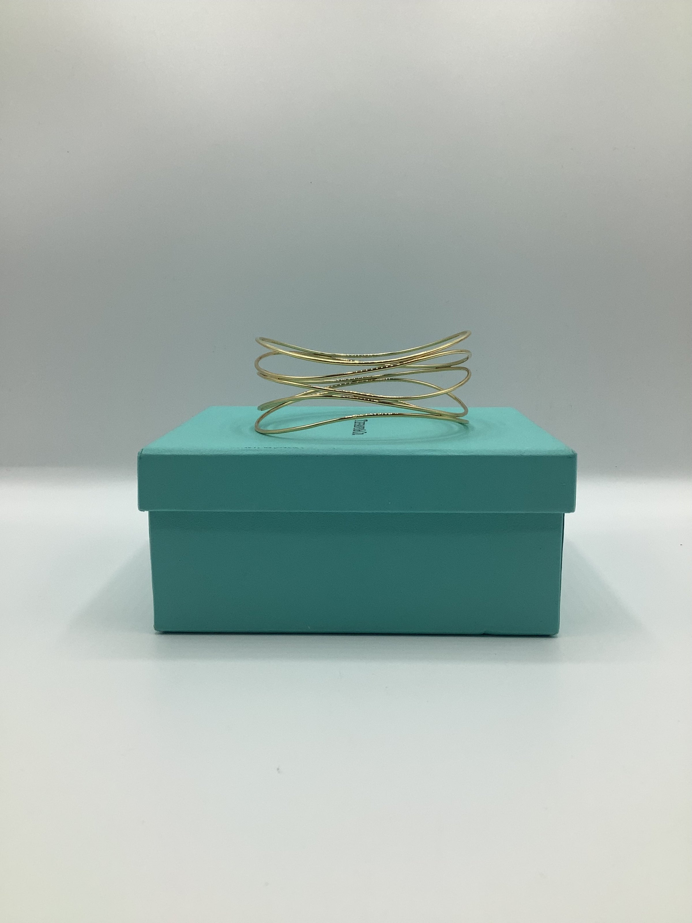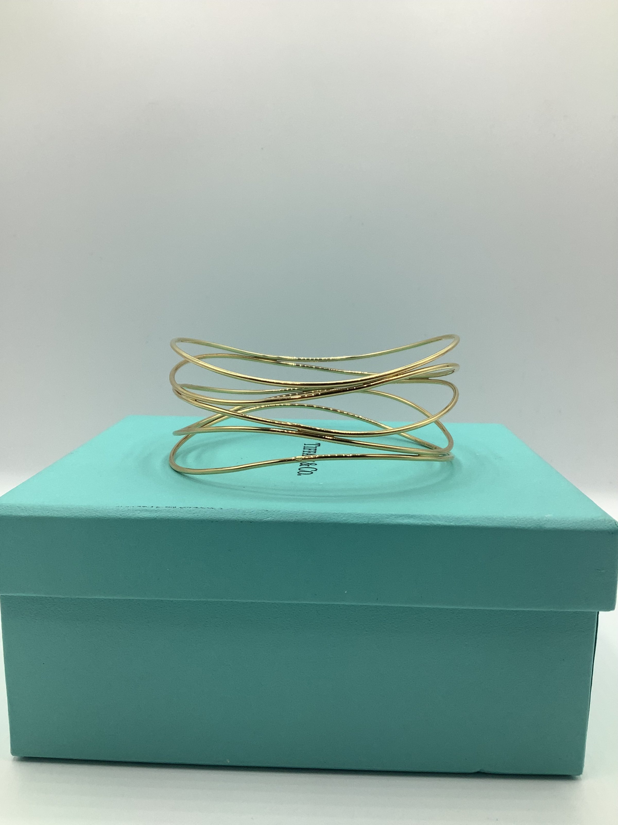 The Tiffany & Co. Elsa Peretti Wave Bangle is a sculptural masterpiece crafted in 18ct gold. Inspired by the fluid lines of the undulating sea, this bangle captures the essence of movement and grace. The Wave collection offers variations with three, five, or nine interlocking rows, each designed to create a harmonious flow around the wrist. The medium size fits wrists up to 6.25 inches, while the large size accommodates wrists up to 6.75 inches. The bangle's design allows it to be worn alone as a statement piece or stacked for a more dramatic effect.