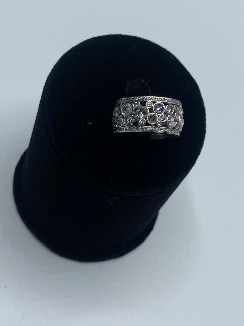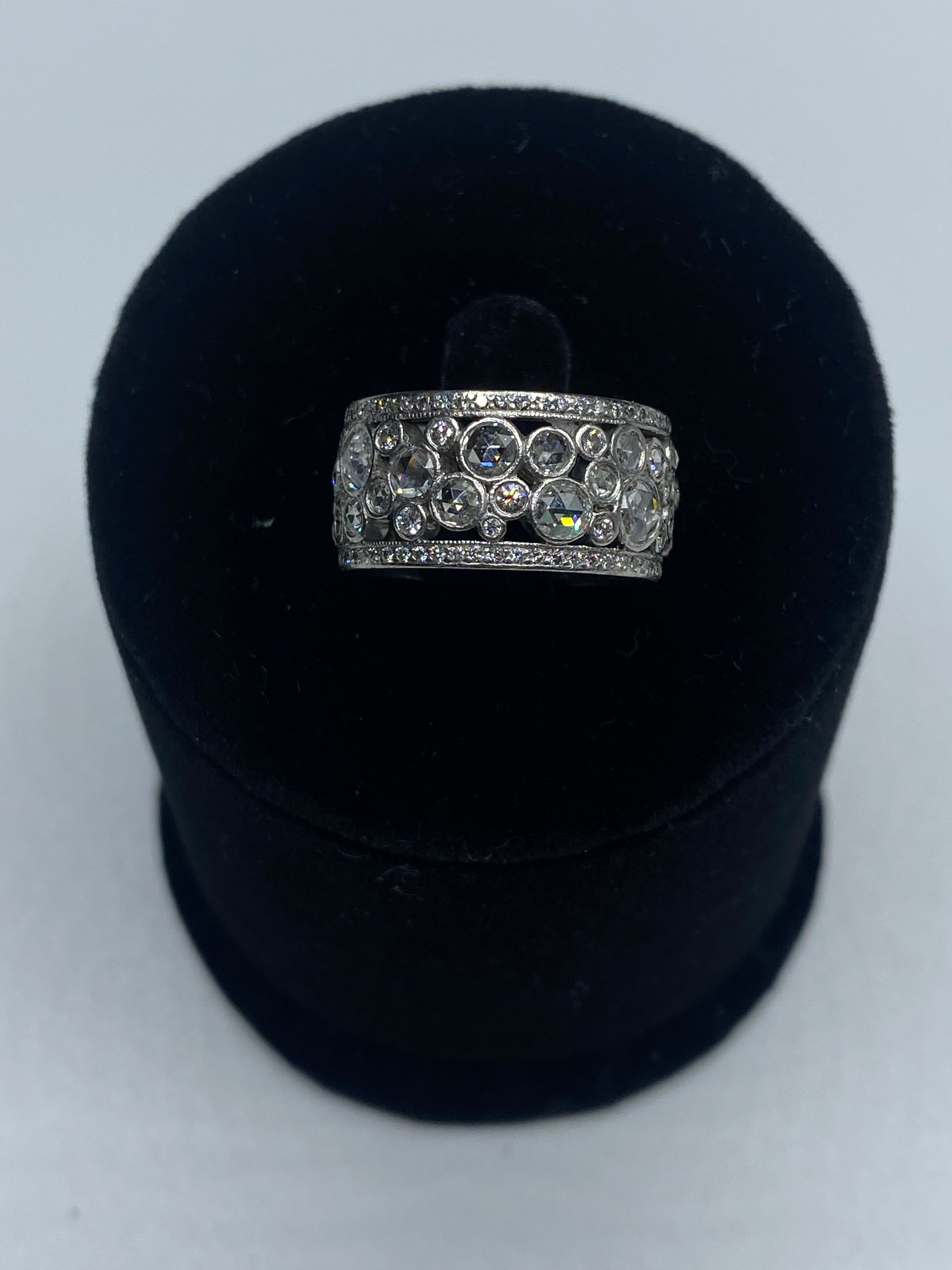 The ring is set with rose cut diamonds varying in size, totalling 1.62ct and pave set round brilliant cut diamonds totalling 0.52ct,