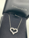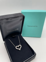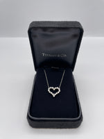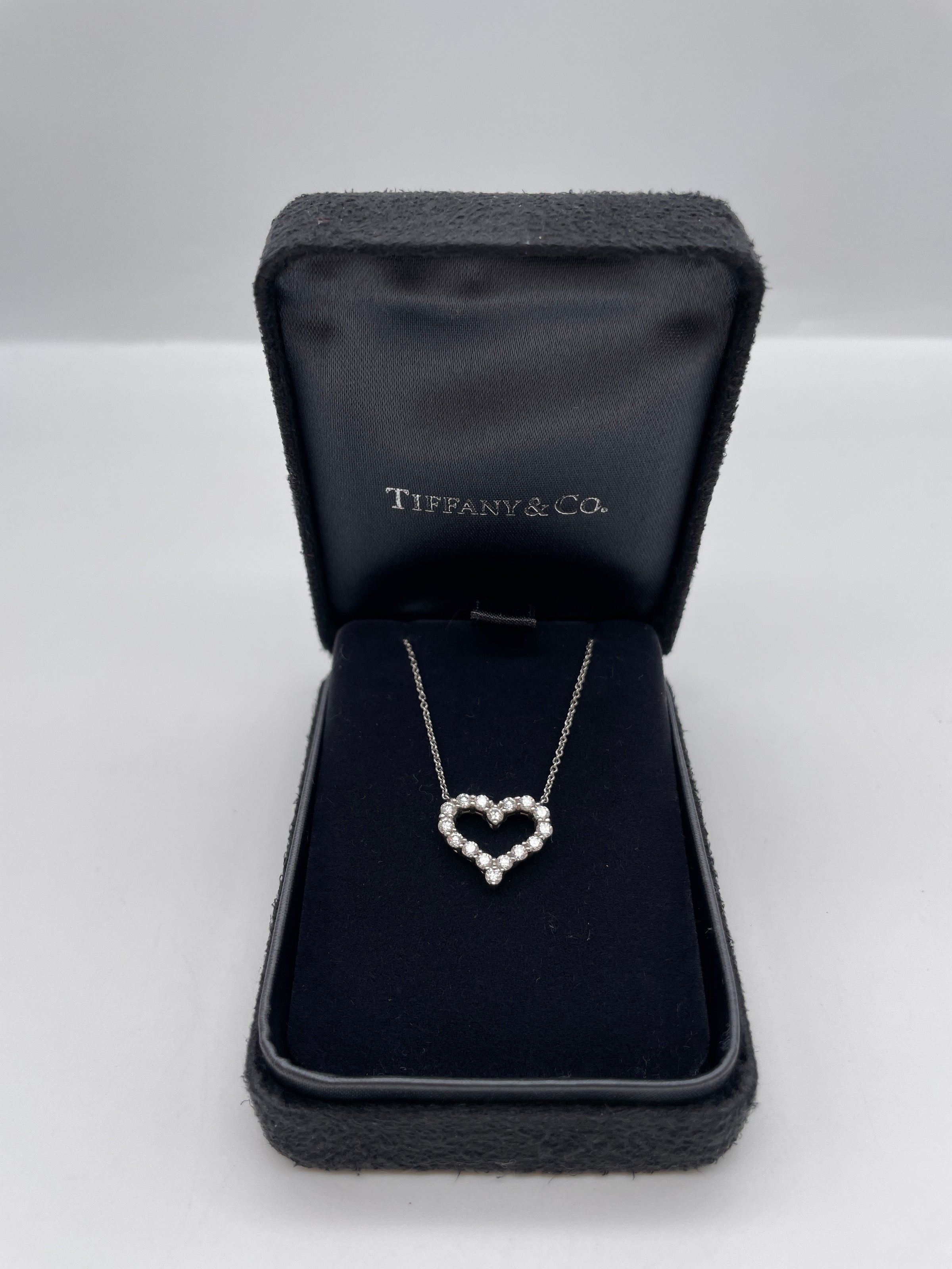 This elegant Tiffany & Co. heart-shaped pendant is crafted in platinum and set with round brilliant-cut diamonds for a timeless and romantic finish. Measuring 16mm wide, the heart pendant showcases Tiffany’s signature clean lines and refined craftsmanship. The 0.54ct total diamond weight adds radiant sparkle without overwhelming the design, making it a perfect piece for everyday luxury or meaningful gifting. The pendant is suspended from a classic 16-inch platinum chain for a delicate, graceful look. -