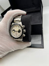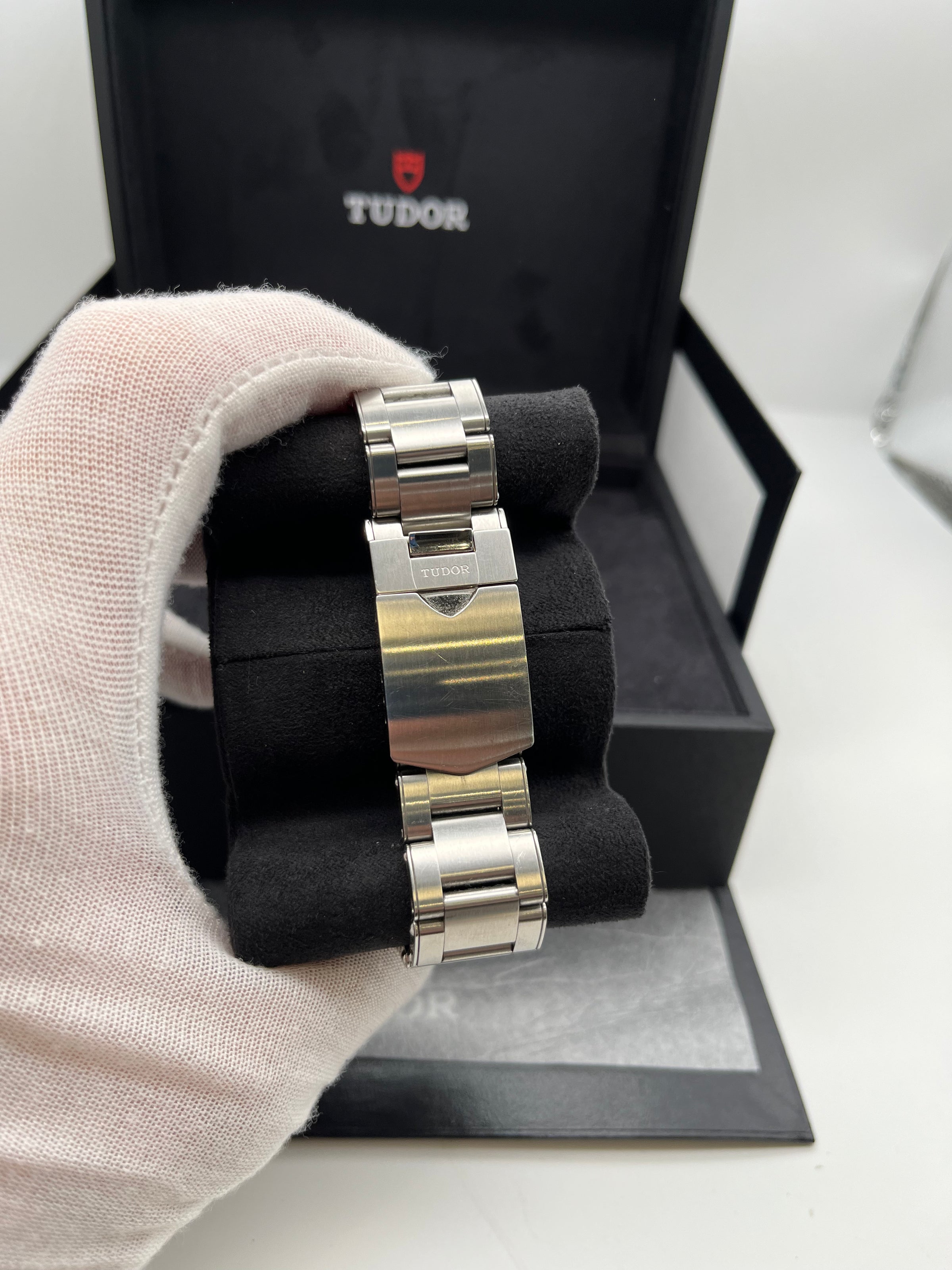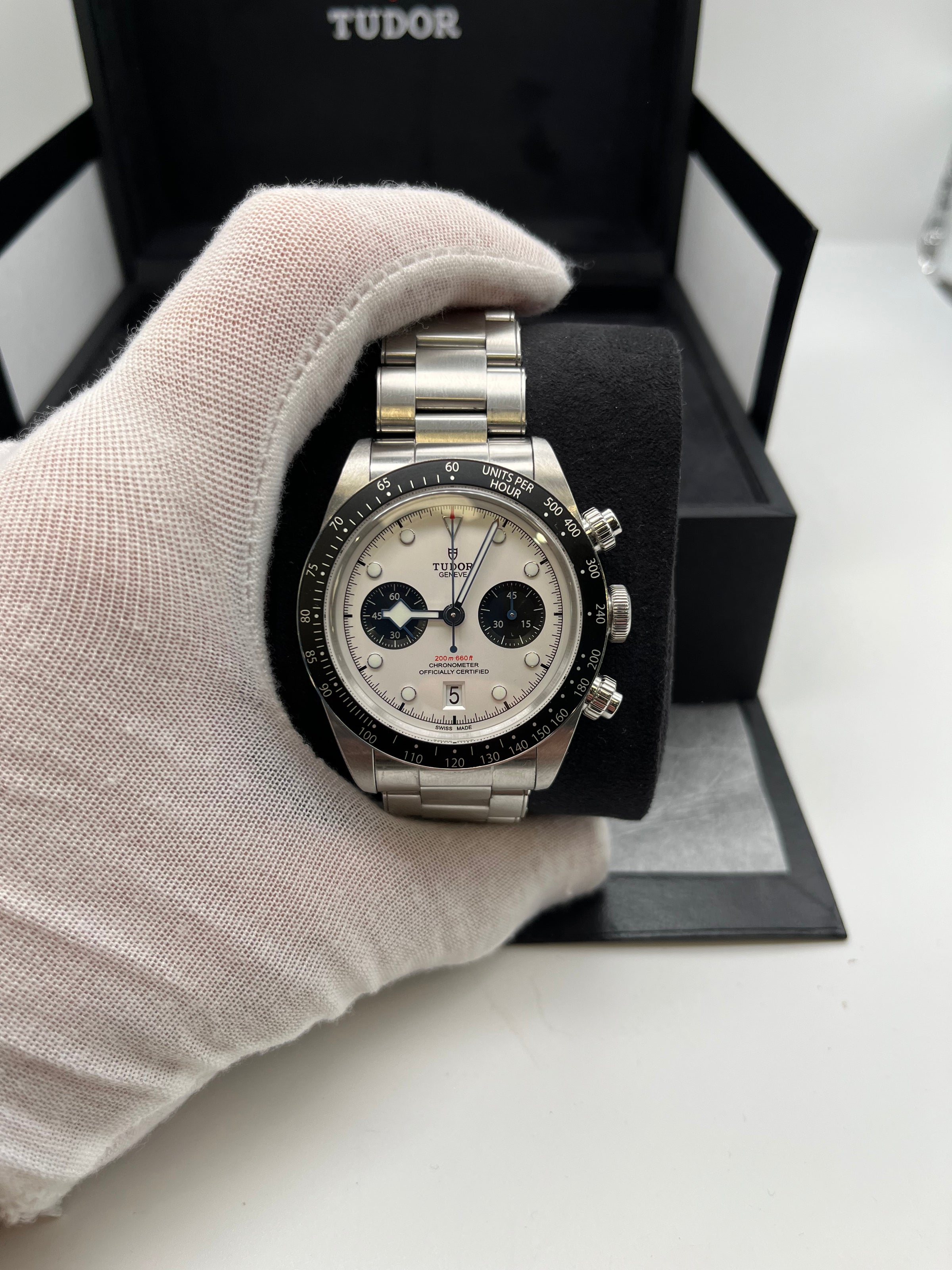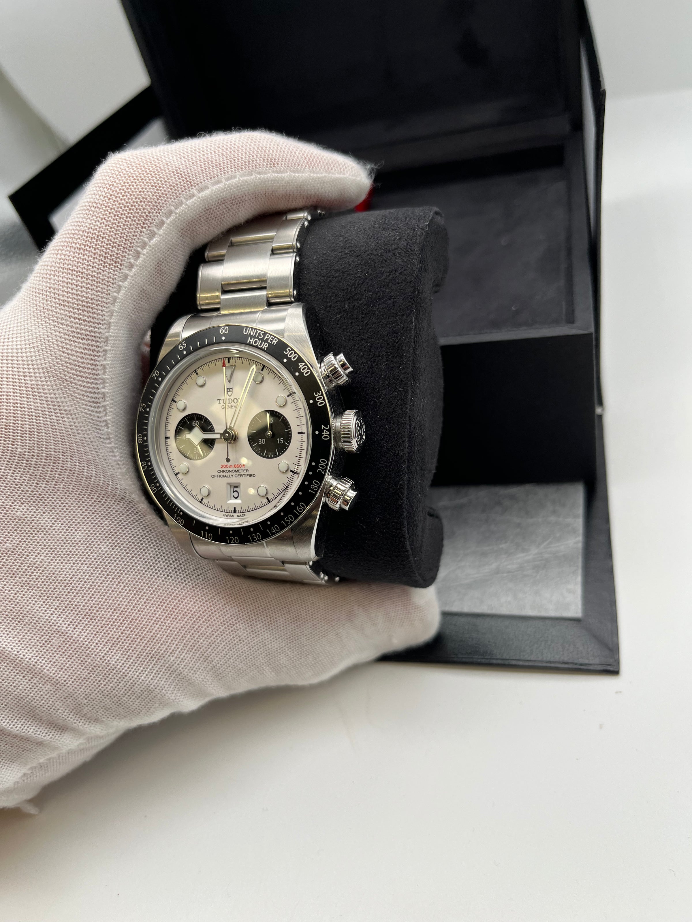 This stunning Tudor chronograph features a 41mm stainless steel case, white dial, black sub dials, steel bezel with matt black anodised aluminium disc with tachymetric scale and silver markings, screw down crown and pushers and a stainless steel bracelet.