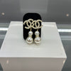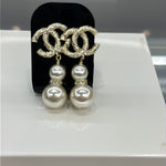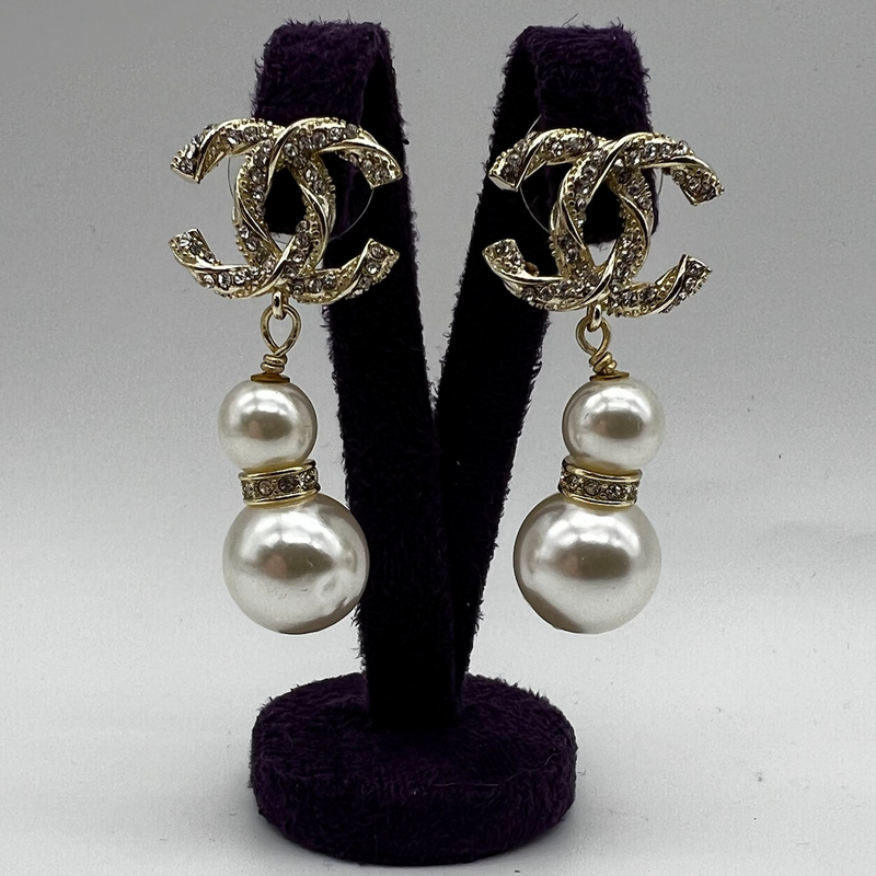 Elegant reworked Chanel drop earrings featuring cream faux pearls suspended from gold-toned settings—classic, refined, and unmistakably Chanel.
