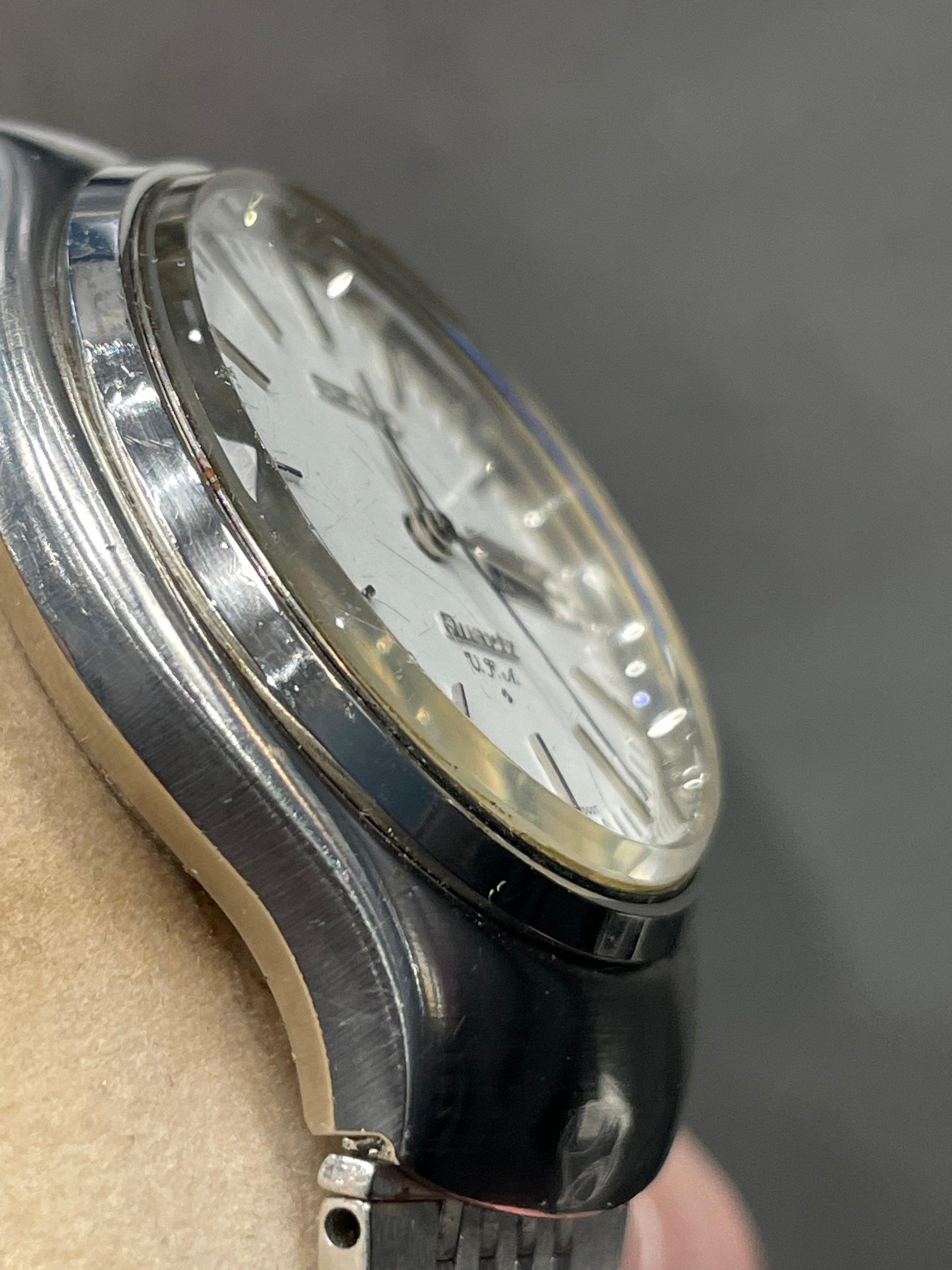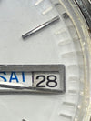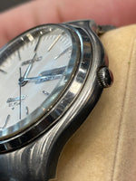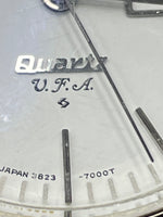 Materials & Design: The Seiko V.F.A. Quartz Model 3823-7001, introduced in the early 1970s, features a distinctive stainless steel case with a sleek, futuristic design. The dial is adorned with applied indices and a day-date display at the 3 o'clock position, protected by a distinctive faceted Hardlex crystal.