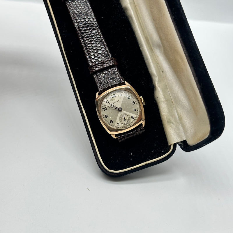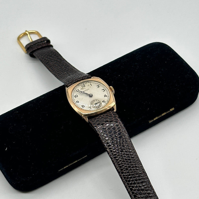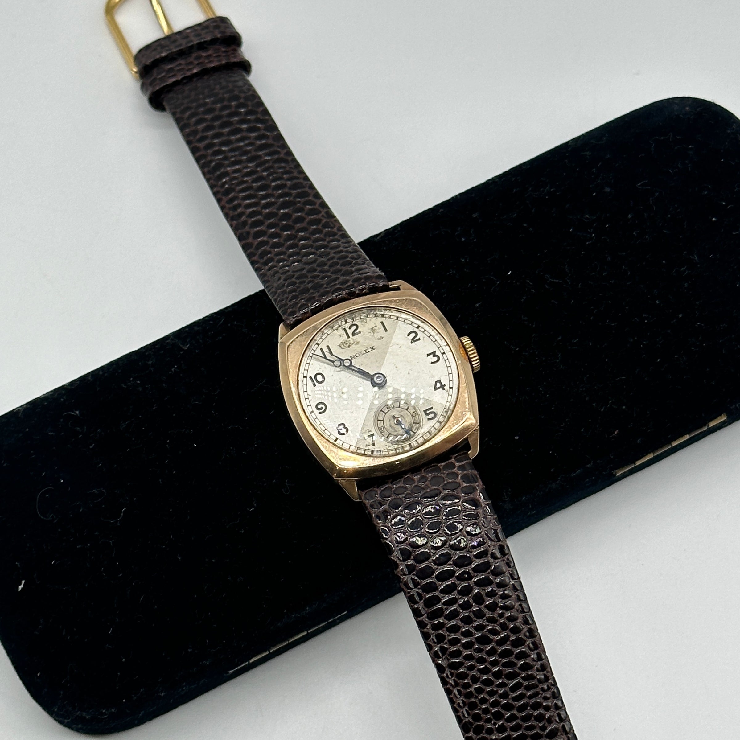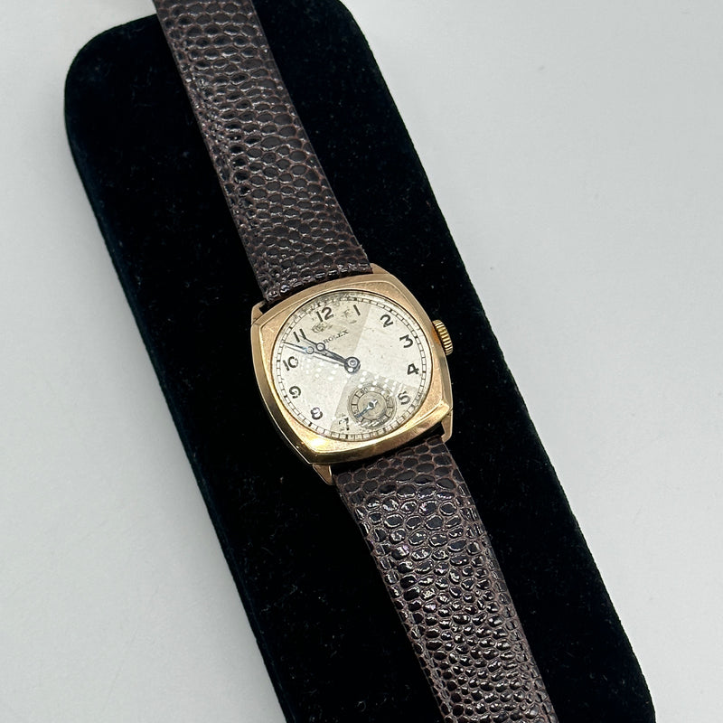 This exquisite 9ct Gold Vintage Rolex wristwatch is a timeless piece of horological history, combining elegance with exceptional craftsmanship. Featuring a classic cushion-shaped case in 9ct yellow gold, it exudes sophistication and subtle luxury. The beautifully textured dial showcases vintage-style Arabic numerals, complemented by a small seconds sub-dial at 6 o’clock, adding charm and functionality.