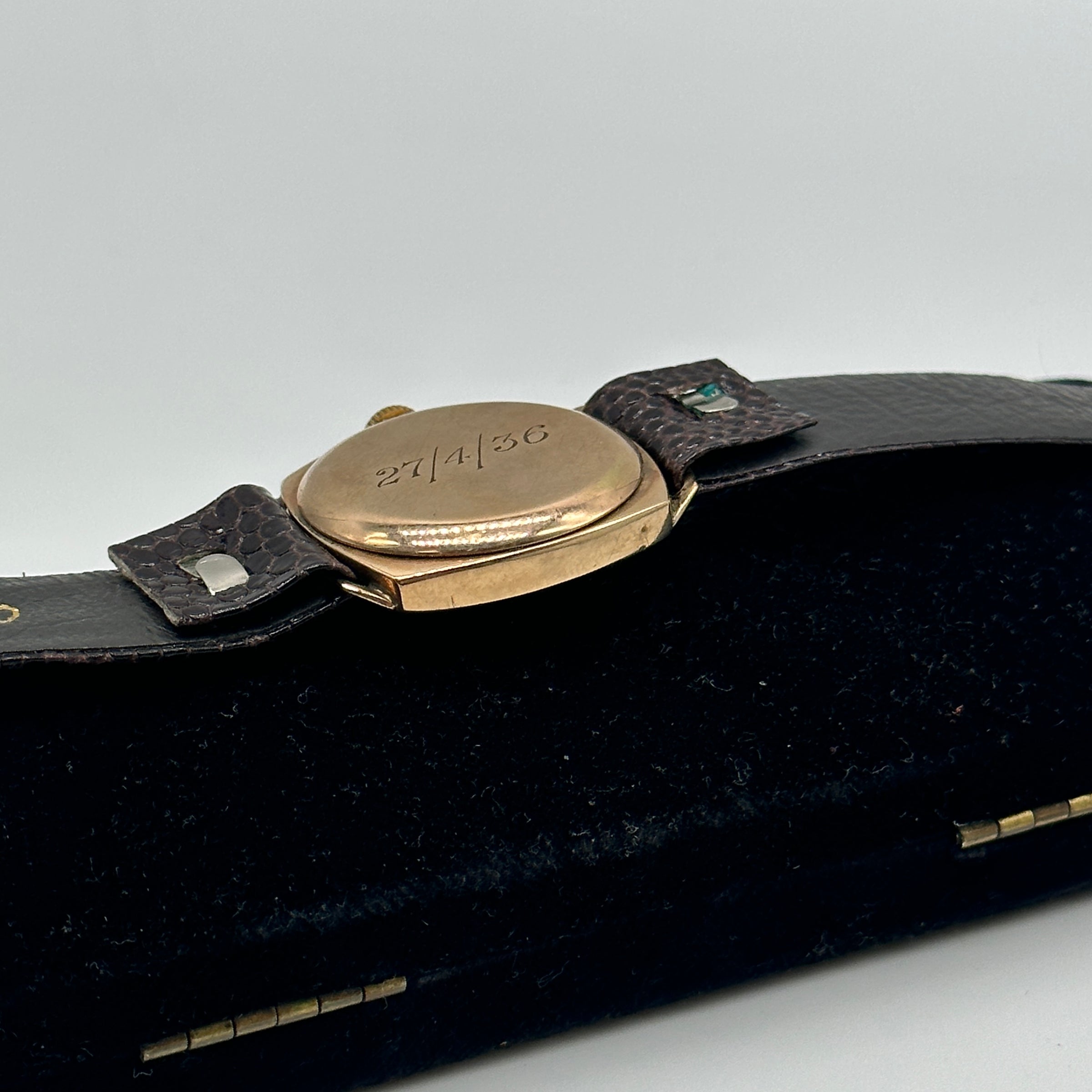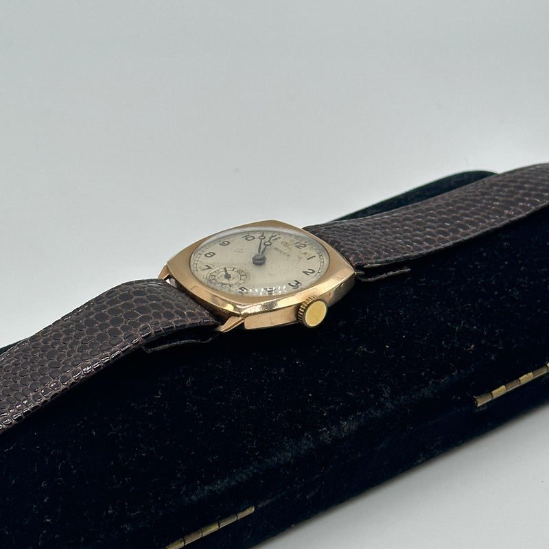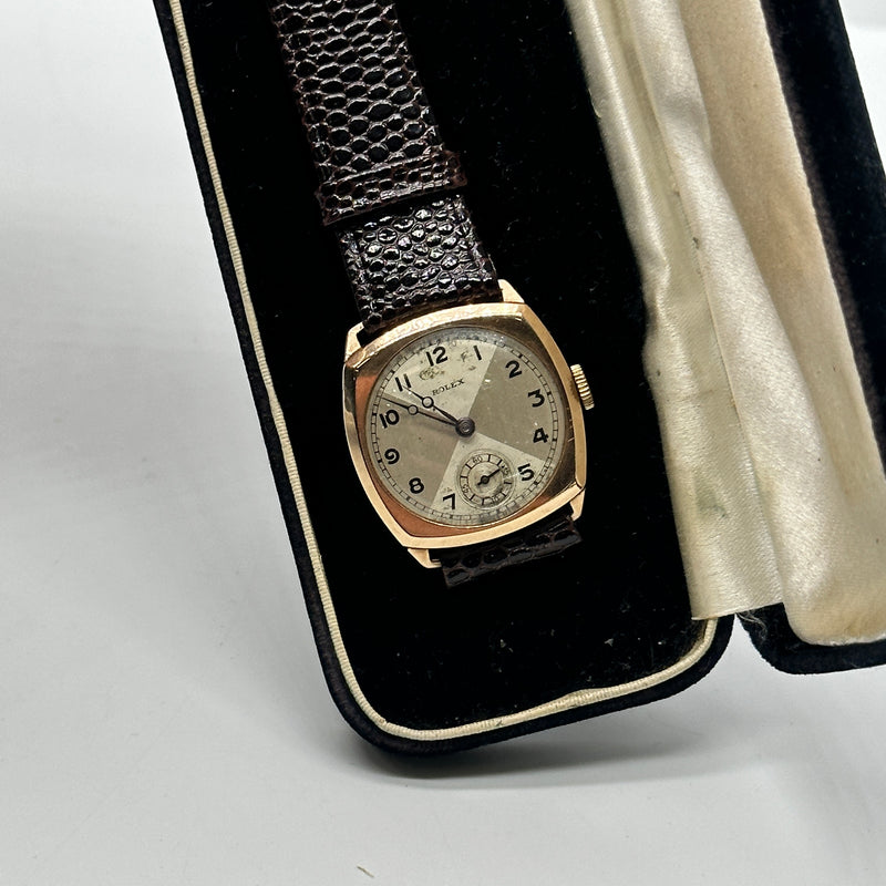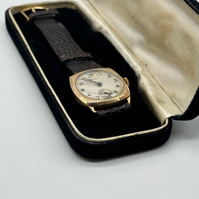This exquisite 9ct Gold Vintage Rolex wristwatch is a timeless piece of horological history, combining elegance with exceptional craftsmanship. Featuring a classic cushion-shaped case in 9ct yellow gold, it exudes sophistication and subtle luxury. The beautifully textured dial showcases vintage-style Arabic numerals, complemented by a small seconds sub-dial at 6 o’clock, adding charm and functionality.