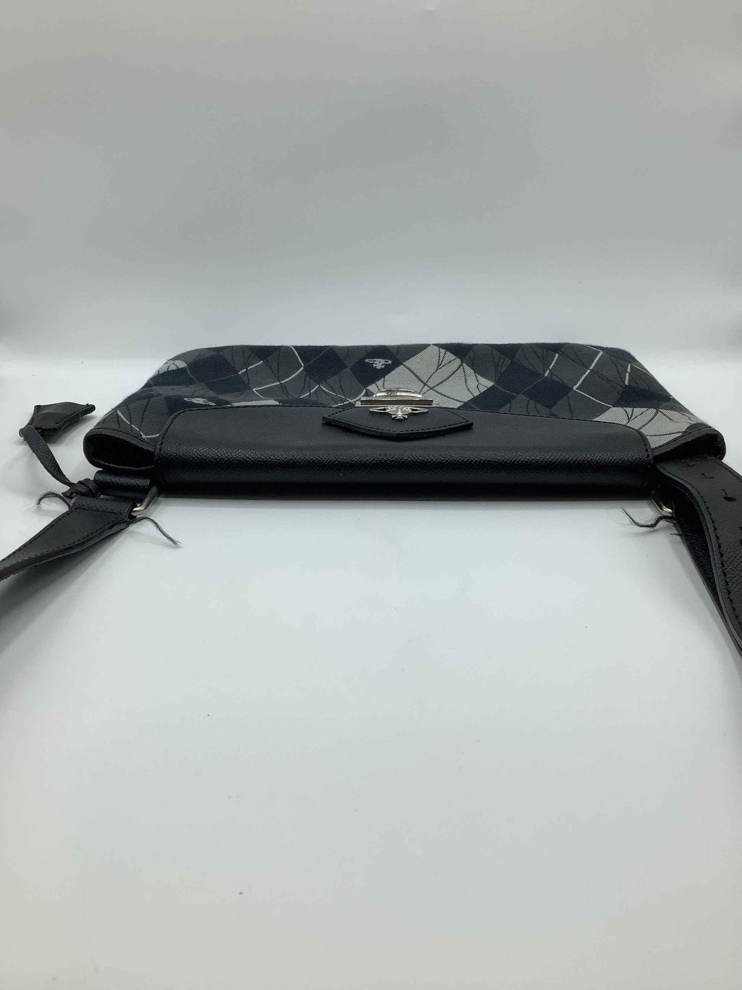 This Vivienne Westwood Envelope Clutch is crafted from premium coated canvas featuring a distinctive grey checkerboard pattern. The structured envelope silhouette is accentuated by the brand's iconic silver-tone Orb emblem on the front flap. A press-stud fastening secures the flap, leading to a compact interior lined in tonal fabric, suitable for essentials. The clutch comes with a crossbody strap, offering versatile styling options. Dimensions are approximately 25cm in width, 16cm in height, and 7cm in depth.