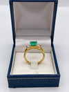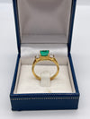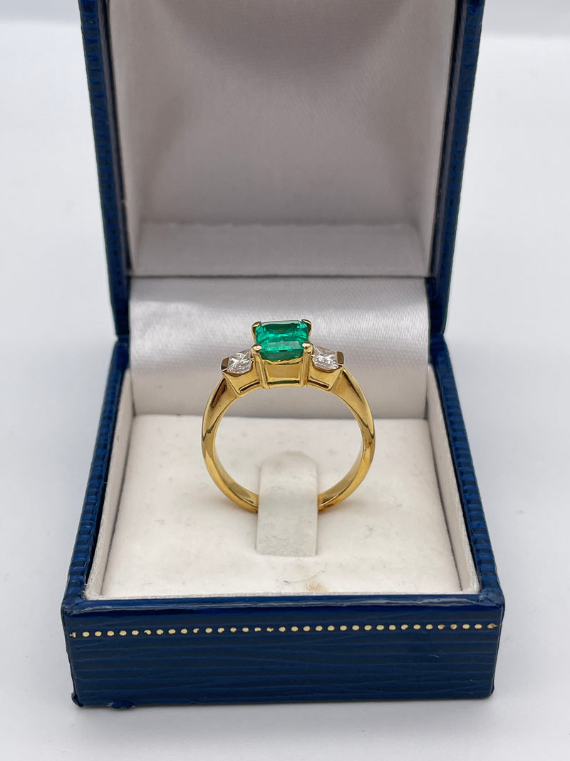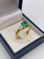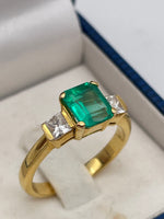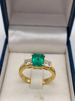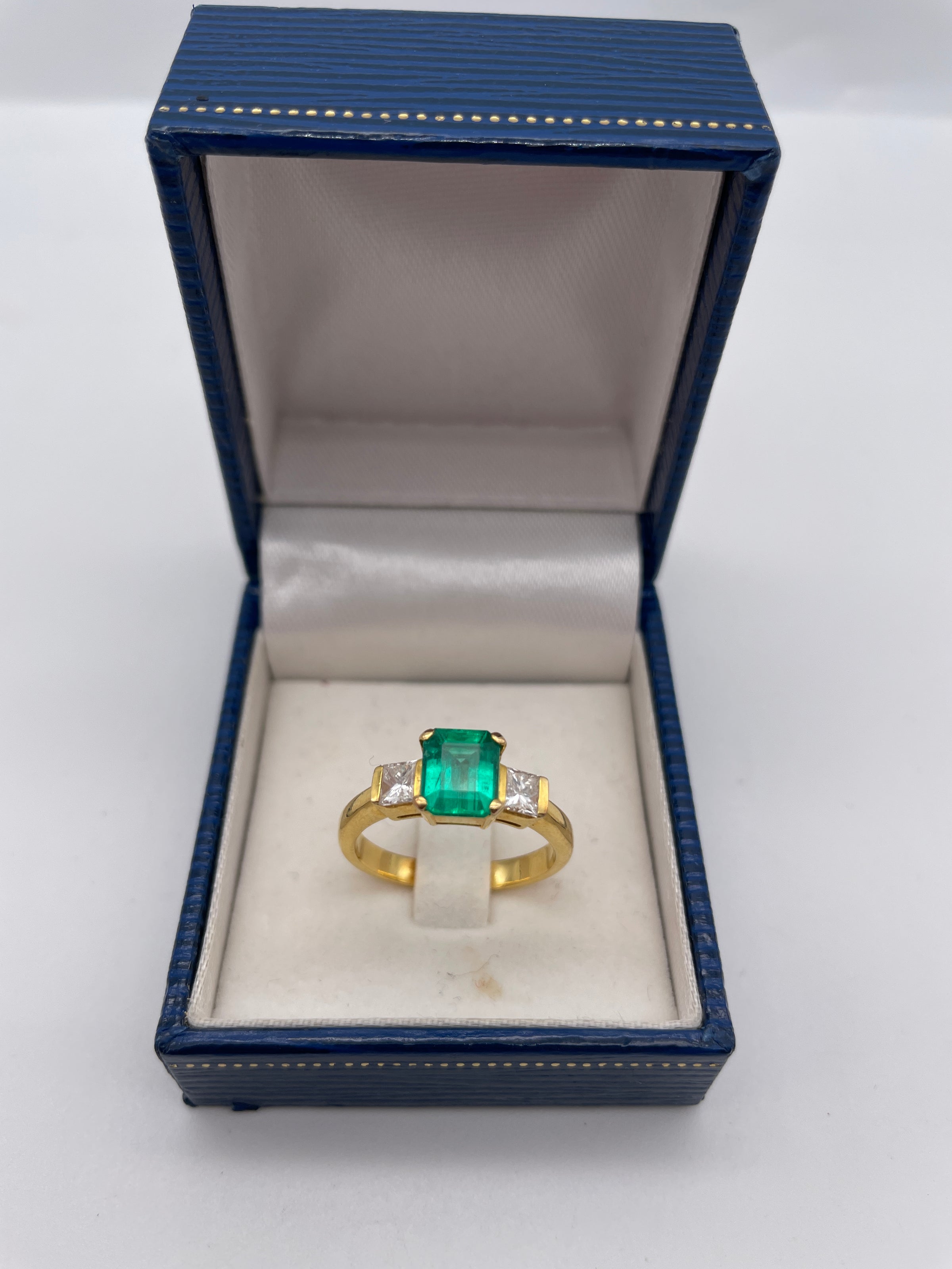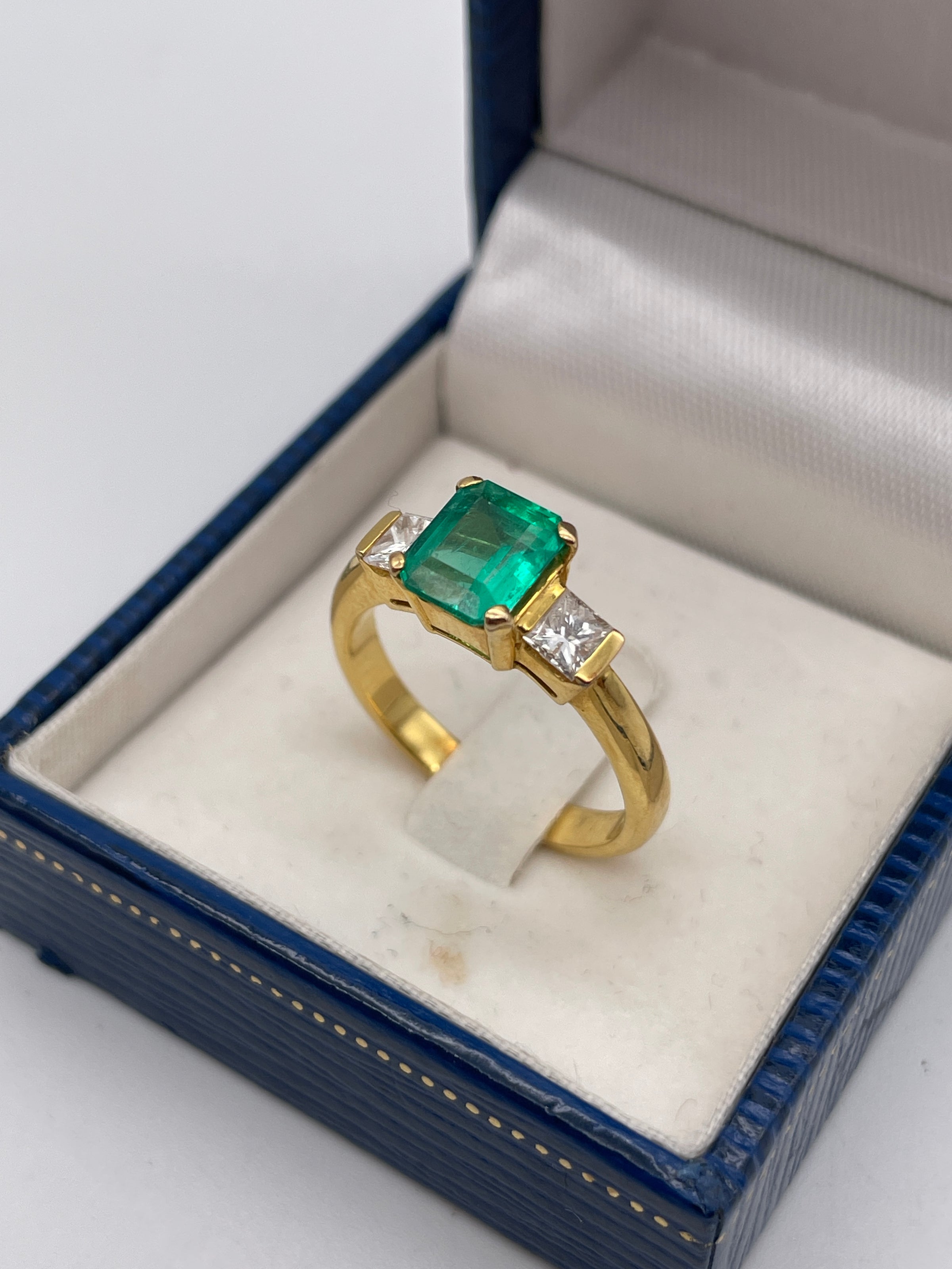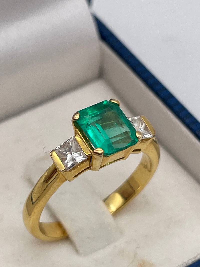 A stunning ladies 18ct yellow gold diamond and emerald ring set with a square cut emerald centre claw set with a channel set princess cut diamond on either shoulder, the emerald in this beautiful ring is of fine quality with stunning colour and vibrance.
