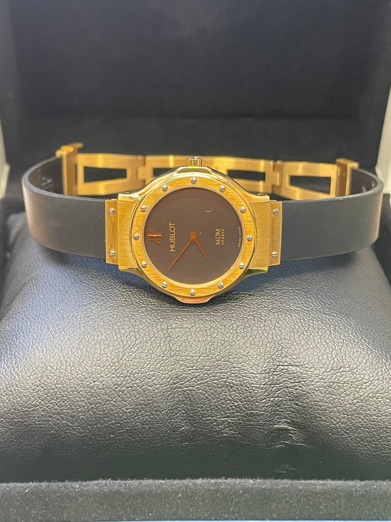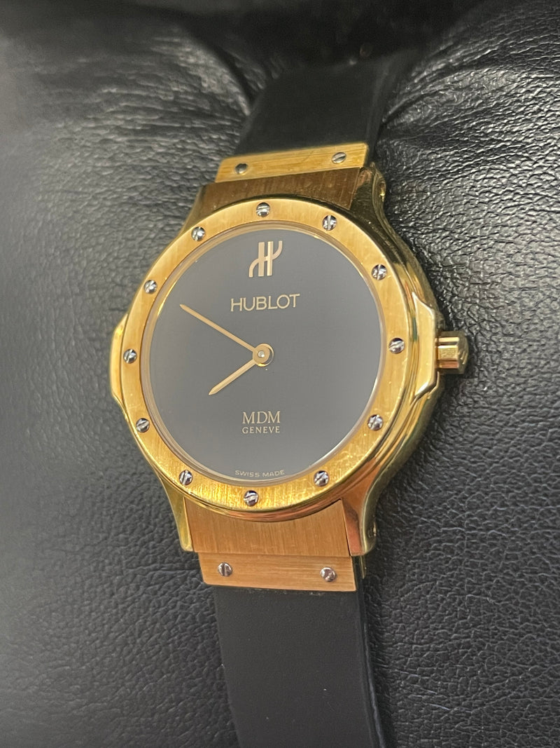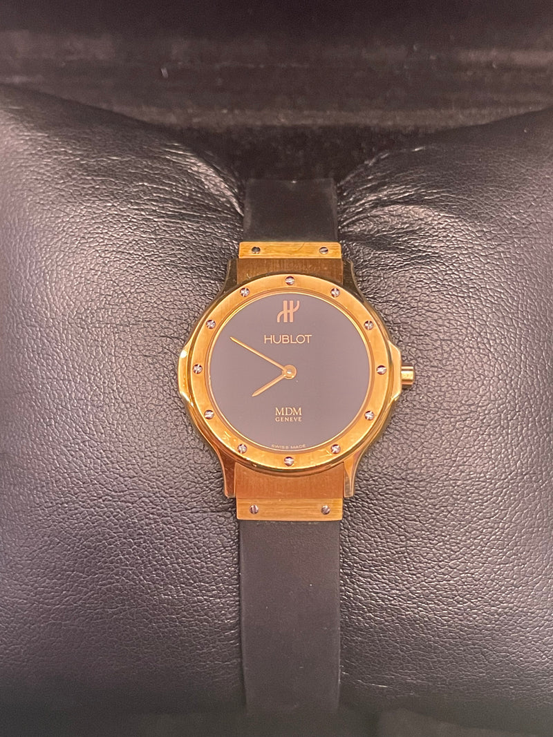 The porthole-shaped watch case combining polished and brushed metal, the minimalist black dial, and the distinctive black natural-rubber strap came to symbolise the Hublot watch.