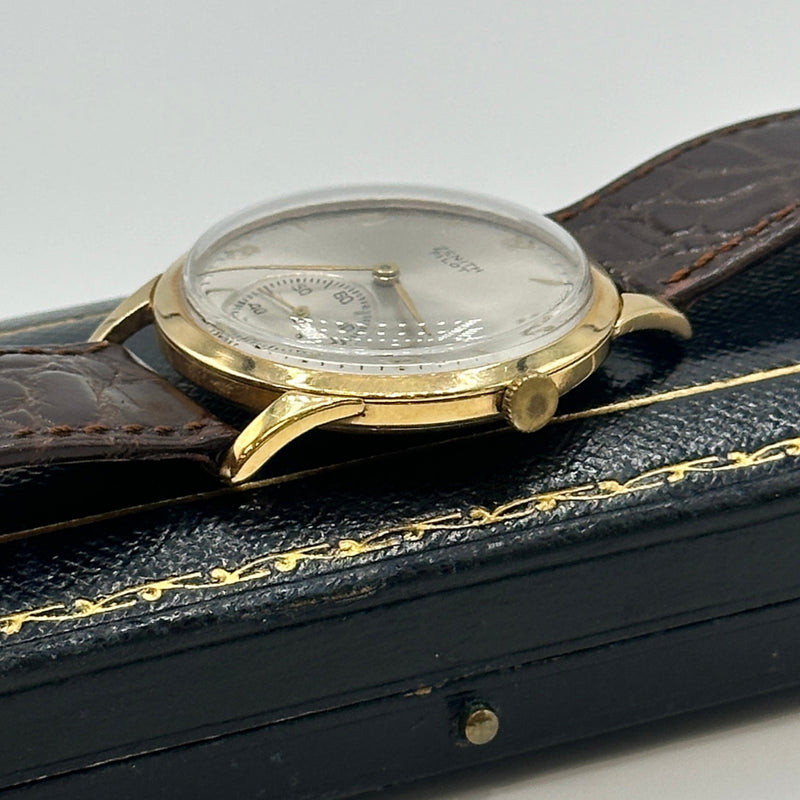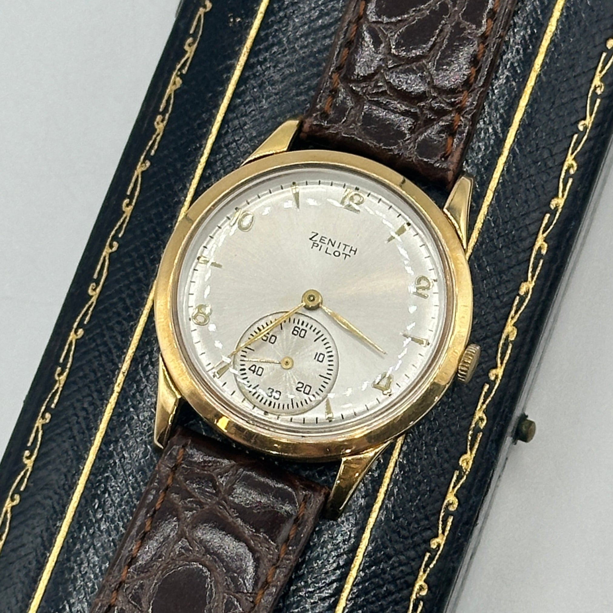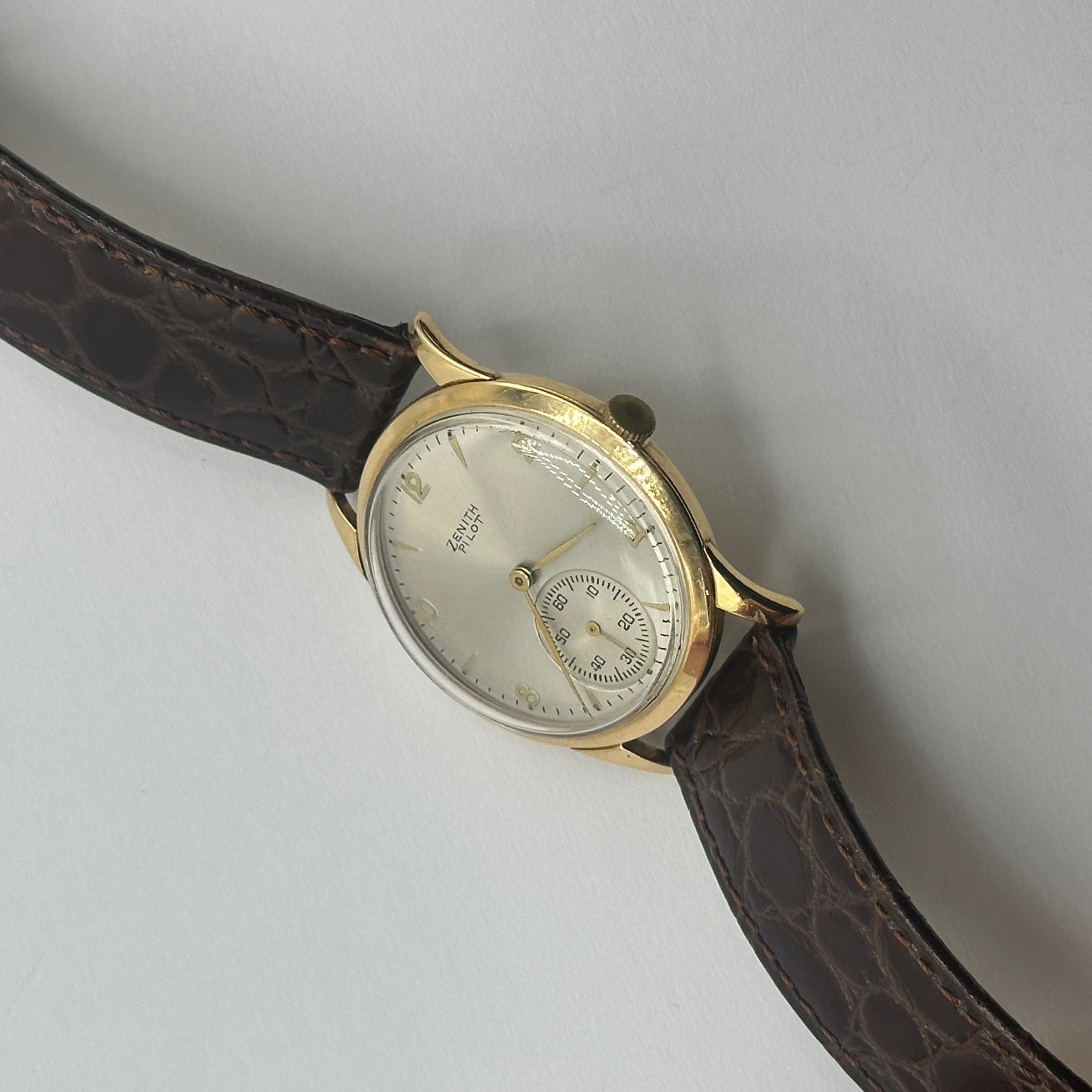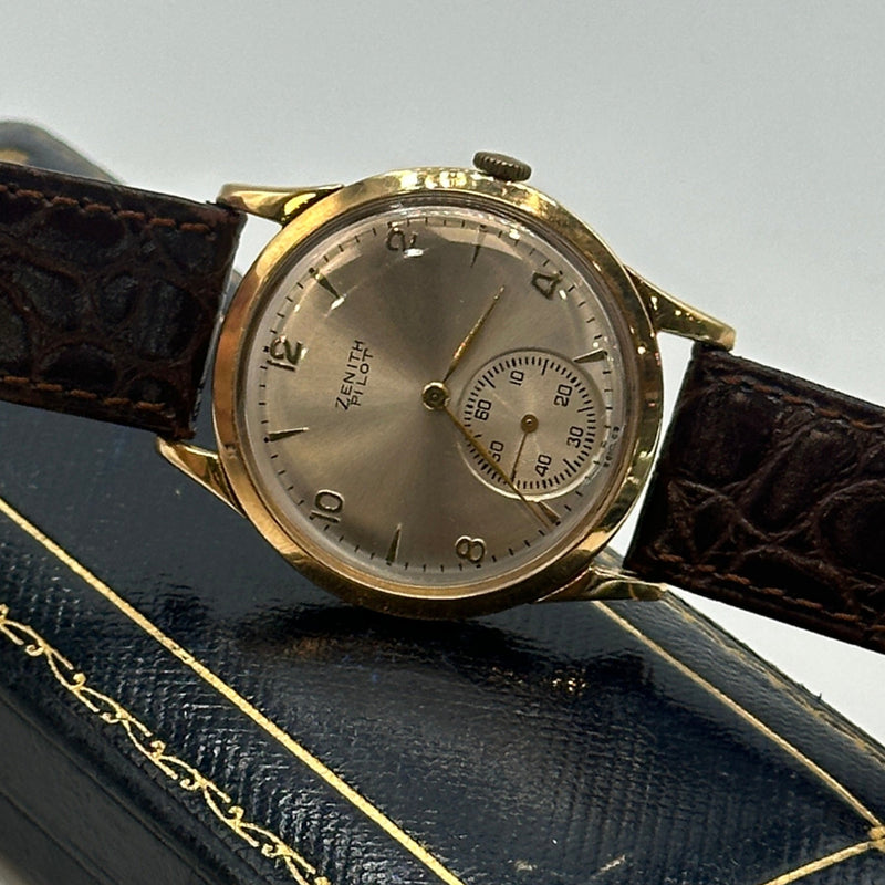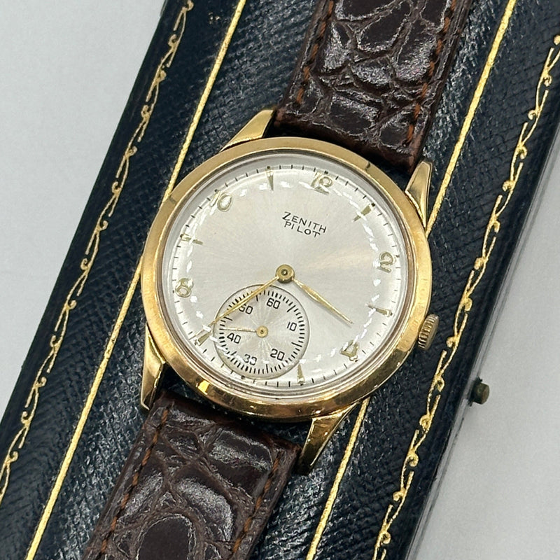This rare Zenith Pilot Limited Edition wristwatch from 1970 is a distinguished piece of horological history. Crafted in 18ct yellow gold the watch features a striking silver sunburst dial adorned with minimalist Arabic numeral hour markers, slender gold-tone hands, and a subsidiary seconds dial positioned at 6 o'clock. Measuring approximately 34mm in diameter, the case is complemented by a rich brown leather strap with a textured crocodile pattern and gold-tone buckle. Powered by a Swiss manual wind movement, this Zenith Pilot model combines vintage military-inspired styling with refined elegance, ideal for discerning collectors.