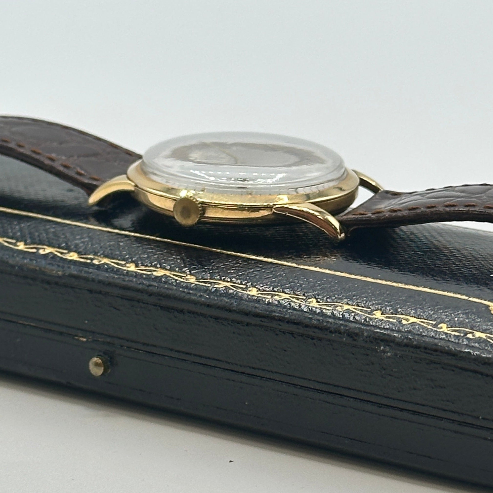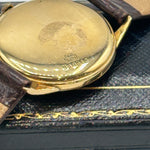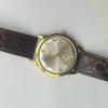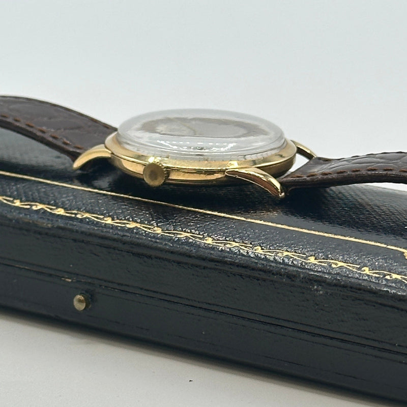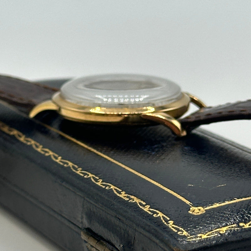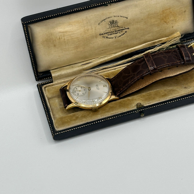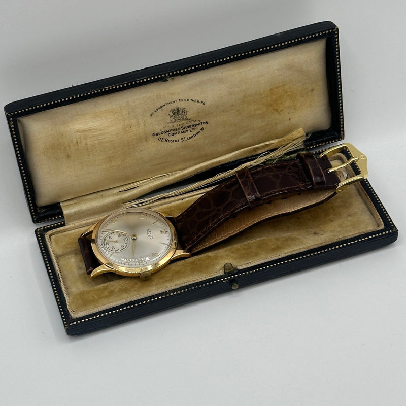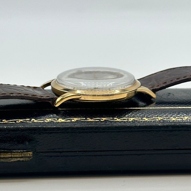 This rare Zenith Pilot Limited Edition wristwatch from 1970 is a distinguished piece of horological history. Crafted in 18ct yellow gold the watch features a striking silver sunburst dial adorned with minimalist Arabic numeral hour markers, slender gold-tone hands, and a subsidiary seconds dial positioned at 6 o'clock. Measuring approximately 34mm in diameter, the case is complemented by a rich brown leather strap with a textured crocodile pattern and gold-tone buckle. Powered by a Swiss manual wind movement, this Zenith Pilot model combines vintage military-inspired styling with refined elegance, ideal for discerning collectors.